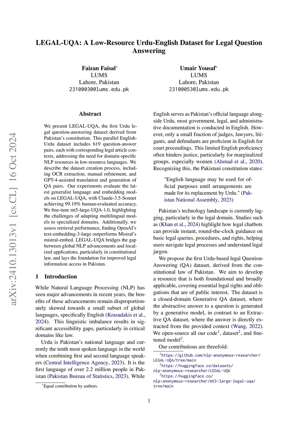 We present LEGAL-UQA, the first Urdu legal question-answering dataset derived from Pakistan's constitution. This parallel English-Urdu dataset includes 619 question-answer pairs, each with corresponding legal article contexts, addressing the need for domain-specific NLP resources in low-resource languages. We describe the dataset creation process, including OCR extraction, manual refinement, and GPT-4-assisted translation and generation of QA pairs. Our experiments evaluate the latest generalist language and embedding models on LEGAL-UQA, with Claude-3.5-Sonnet achieving 99.19% human-evaluated accuracy. We fine-tune mt5-large-UQA-1.0, highlighting the challenges of adapting multilingual models to specialized domains. Additionally, we assess retrieval performance, finding OpenAI's text-embedding-3-large outperforms Mistral's mistral-embed. LEGAL-UQA bridges the gap between global NLP advancements and localized applications, particularly in constitutional law, and lays the foundation for improved legal information access in Pakistan.