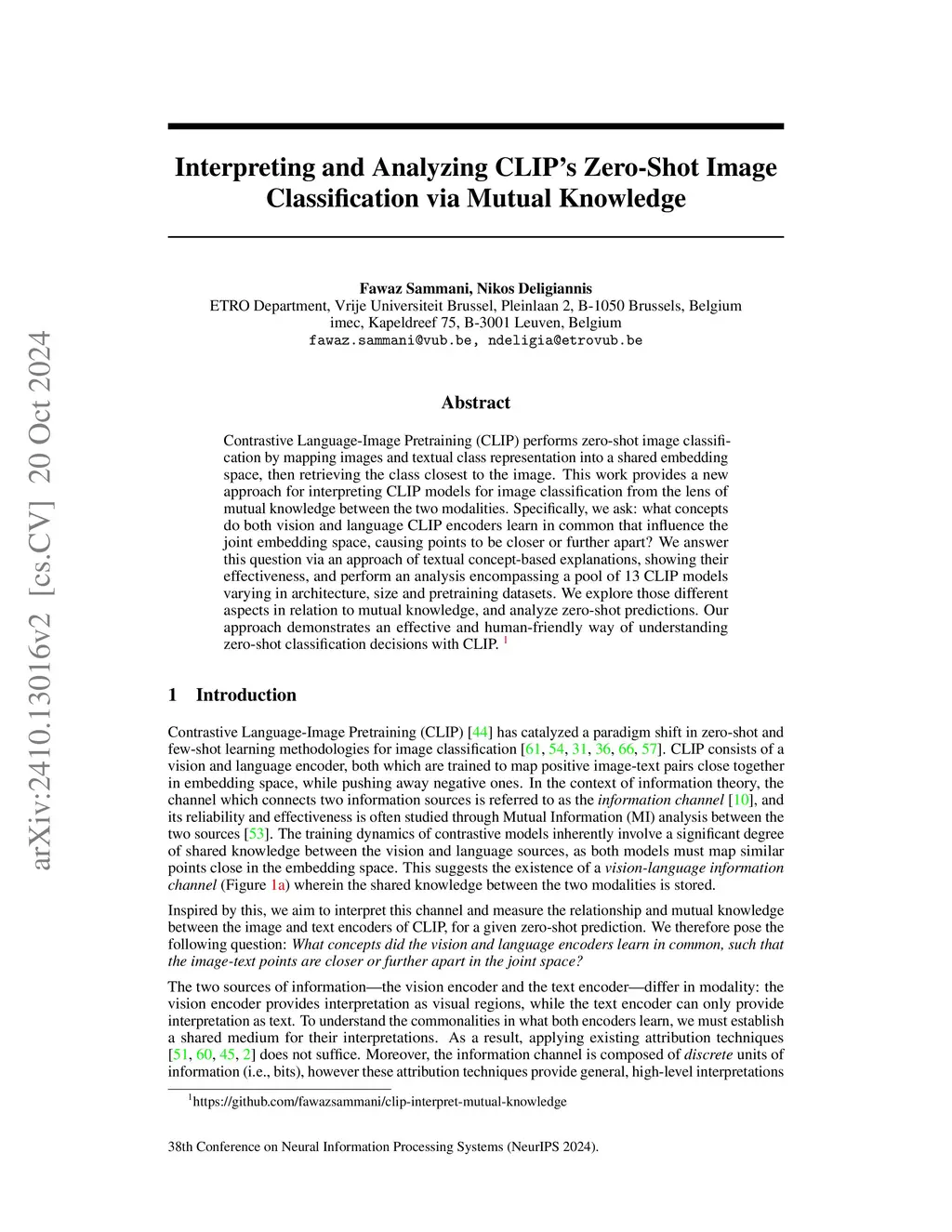 Contrastive Language-Image Pretraining (CLIP) performs zero-shot image classification by mapping images and textual class representation into a shared embedding space, then retrieving the class closest to the image. This work provides a new approach for interpreting CLIP models for image classification from the lens of mutual knowledge between the two modalities. Specifically, we ask: what concepts do both vision and language CLIP encoders learn in common that influence the joint embedding space, causing points to be closer or further apart? We answer this question via an approach of textual concept-based explanations, showing their effectiveness, and perform an analysis encompassing a pool of 13 CLIP models varying in architecture, size and pretraining datasets. We explore those different aspects in relation to mutual knowledge, and analyze zero-shot predictions. Our approach demonstrates an effective and human-friendly way of understanding zero-shot classification decisions with CLIP.