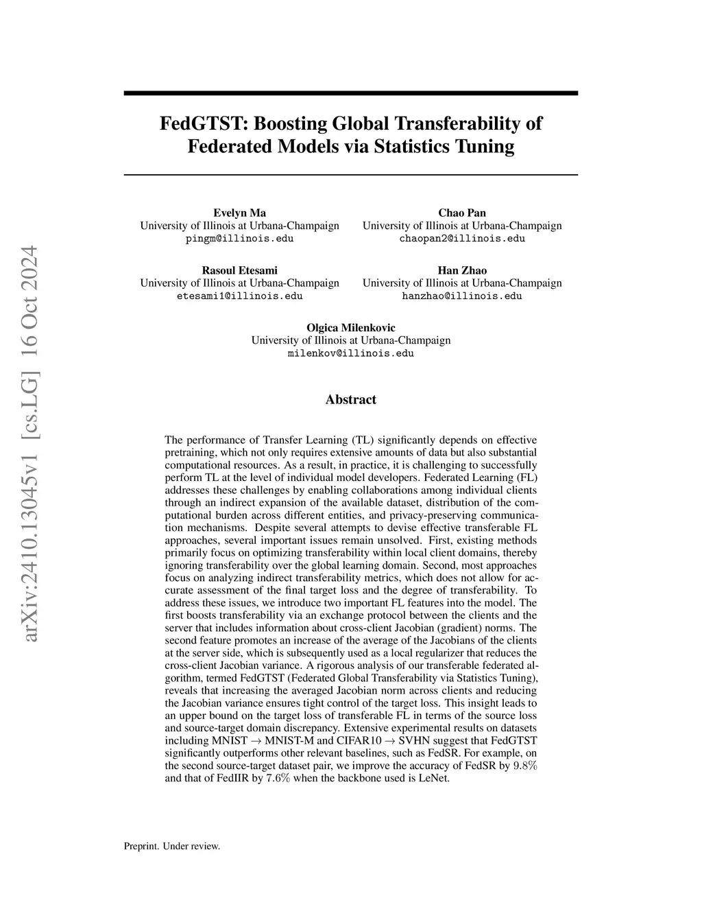 The performance of Transfer Learning (TL) heavily relies on effective pretraining, which demands large datasets and substantial computational resources. As a result, executing TL is often challenging for individual model developers. Federated Learning (FL) addresses these issues by facilitating collaborations among clients, expanding the dataset indirectly, distributing computational costs, and preserving privacy. However, key challenges remain unresolved. First, existing FL methods tend to optimize transferability only within local domains, neglecting the global learning domain. Second, most approaches rely on indirect transferability metrics, which do not accurately reflect the final target loss or true degree of transferability. To address these gaps, we propose two enhancements to FL. First, we introduce a client-server exchange protocol that leverages cross-client Jacobian (gradient) norms to boost transferability. Second, we increase the average Jacobian norm across clients at the server, using this as a local regularizer to reduce cross-client Jacobian variance. Our transferable federated algorithm, termed FedGTST (Federated Global Transferability via Statistics Tuning), demonstrates that increasing the average Jacobian and reducing its variance allows for tighter control of the target loss. This leads to an upper bound on the target loss in terms of the source loss and source-target domain discrepancy. Extensive experiments on datasets such as MNIST to MNIST-M and CIFAR10 to SVHN show that FedGTST outperforms relevant baselines, including FedSR. On the second dataset pair, FedGTST improves accuracy by 9.8% over FedSR and 7.6% over FedIIR when LeNet is used as the backbone.