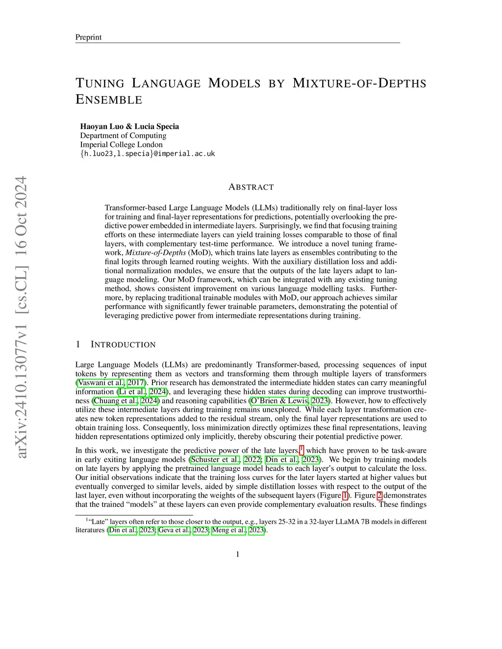 Transformer-based Large Language Models (LLMs) traditionally rely on final-layer loss for training and final-layer representations for predictions, potentially overlooking the predictive power embedded in intermediate layers. Surprisingly, we find that focusing training efforts on these intermediate layers can yield training losses comparable to those of final layers, with complementary test-time performance. We introduce a novel tuning framework, Mixture-of-Depths (MoD), which trains late layers as ensembles contributing to the final logits through learned routing weights. With the auxiliary distillation loss and additional normalization modules, we ensure that the outputs of the late layers adapt to language modeling. Our MoD framework, which can be integrated with any existing tuning method, shows consistent improvement on various language modelling tasks. Furthermore, by replacing traditional trainable modules with MoD, our approach achieves similar performance with significantly fewer trainable parameters, demonstrating the potential of leveraging predictive power from intermediate representations during training.