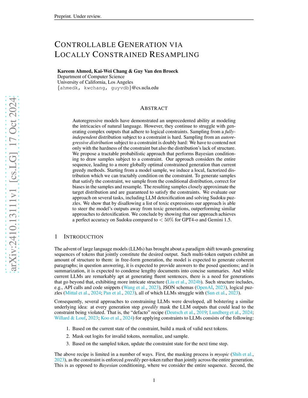 Autoregressive models have demonstrated an unprecedented ability at modeling the intricacies of natural language. However, they continue to struggle with generating complex outputs that adhere to logical constraints. Sampling from a fully-independent distribution subject to a constraint is hard. Sampling from an autoregressive distribution subject to a constraint is doubly hard: We have to contend not only with the hardness of the constraint but also the distribution's lack of structure. We propose a tractable probabilistic approach that performs Bayesian conditioning to draw samples subject to a constraint. Our approach considers the entire sequence, leading to a more globally optimal constrained generation than current greedy methods. Starting from a model sample, we induce a local, factorized distribution which we can tractably condition on the constraint. To generate samples that satisfy the constraint, we sample from the conditional distribution, correct for biases in the samples and resample. The resulting samples closely approximate the target distribution and are guaranteed to satisfy the constraints. We evaluate our approach on several tasks, including LLM detoxification and solving Sudoku puzzles. We show that by disallowing a list of toxic expressions our approach is able to steer the model's outputs away from toxic generations, outperforming similar approaches to detoxification. We conclude by showing that our approach achieves a perfect accuracy on Sudoku compared to <50% for GPT4-o and Gemini 1.5.