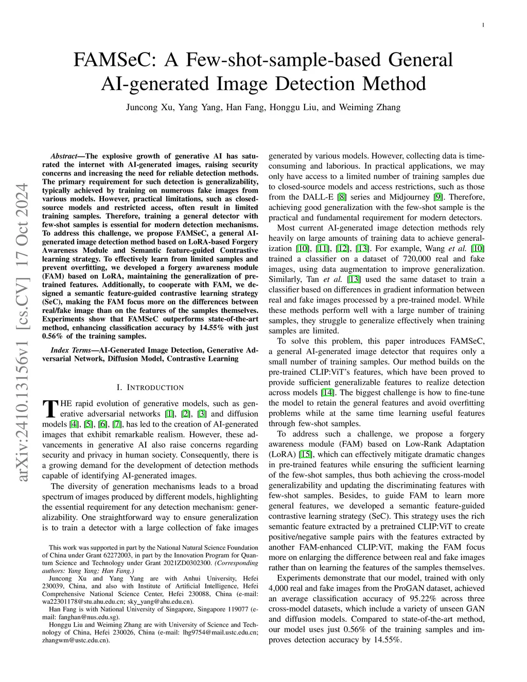 The explosive growth of generative AI has saturated the internet with AI-generated images, raising security concerns and increasing the need for reliable detection methods. The primary requirement for such detection is generalizability, typically achieved by training on numerous fake images from various models. However, practical limitations, such as closed-source models and restricted access, often result in limited training samples. Therefore, training a general detector with few-shot samples is essential for modern detection mechanisms. To address this challenge, we propose FAMSeC, a general AI-generated image detection method based on LoRA-based Forgery Awareness Module and Semantic feature-guided Contrastive learning strategy. To effectively learn from limited samples and prevent overfitting, we developed a Forgery Awareness Module (FAM) based on LoRA, maintaining the generalization of pre-trained features. Additionally, to cooperate with FAM, we designed a Semantic feature-guided Contrastive learning strategy (SeC), making the FAM focus more on the differences between real/fake image than on the features of the samples themselves. Experiments show that FAMSeC outperforms state-of-the-art method, enhancing classification accuracy by 14.55% with just 0.56% of the training samples.