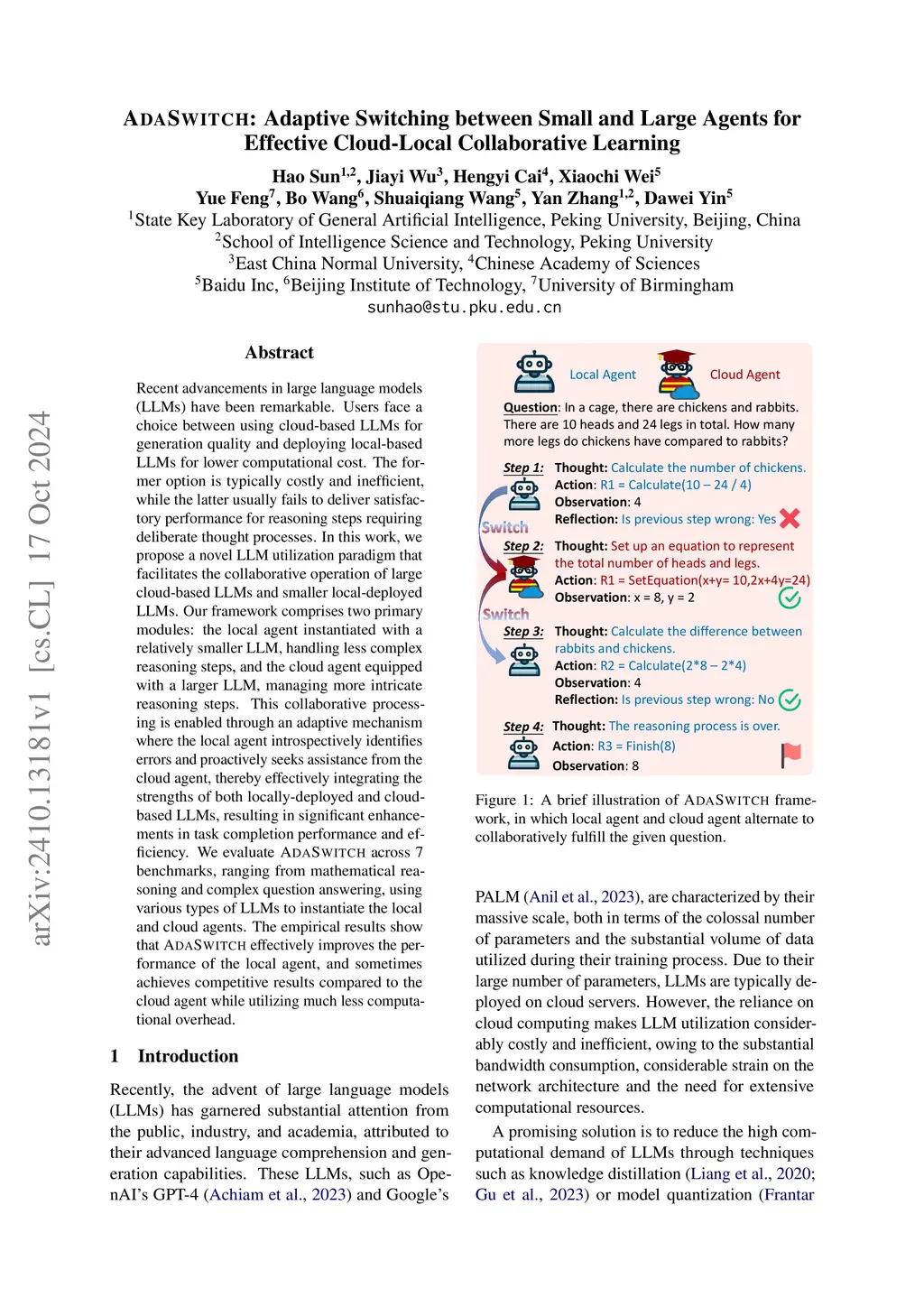 Recent advancements in large language models (LLMs) have been remarkable. Users face a choice between using cloud-based LLMs for generation quality and deploying local-based LLMs for lower computational cost. The former option is typically costly and inefficient, while the latter usually fails to deliver satisfactory performance for reasoning steps requiring deliberate thought processes. In this work, we propose a novel LLM utilization paradigm that facilitates the collaborative operation of large cloud-based LLMs and smaller local-deployed LLMs. Our framework comprises two primary modules: the local agent instantiated with a relatively smaller LLM, handling less complex reasoning steps, and the cloud agent equipped with a larger LLM, managing more intricate reasoning steps. This collaborative processing is enabled through an adaptive mechanism where the local agent introspectively identifies errors and proactively seeks assistance from the cloud agent, thereby effectively integrating the strengths of both locally-deployed and cloud-based LLMs, resulting in significant enhancements in task completion performance and efficiency. We evaluate AdaSwitch across 7 benchmarks, ranging from mathematical reasoning and complex question answering, using various types of LLMs to instantiate the local and cloud agents. The empirical results show that AdaSwitch effectively improves the performance of the local agent, and sometimes achieves competitive results compared to the cloud agent while utilizing much less computational overhead.