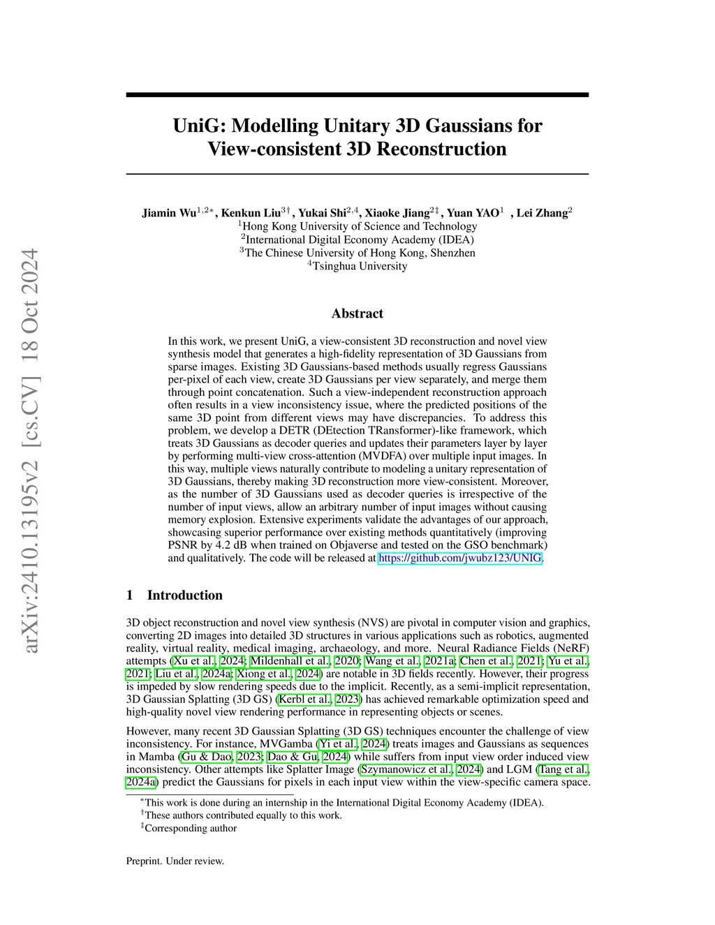 In this work, we introduce UniGS, a novel 3D Gaussian reconstruction and novel view synthesis model that predicts a high-fidelity representation of 3D Gaussians from arbitrary number of posed sparse-view images. Previous methods often regress 3D Gaussians locally on a per-pixel basis for each view and then transfer them to world space and merge them through point concatenation. In contrast, Our approach involves modeling unitary 3D Gaussians in world space and updating them layer by layer. To leverage information from multi-view inputs for updating the unitary 3D Gaussians, we develop a DETR (DEtection TRansformer)-like framework, which treats 3D Gaussians as queries and updates their parameters by performing multi-view cross-attention (MVDFA) across multiple input images, which are treated as keys and values. This approach effectively avoids `ghosting' issue and allocates more 3D Gaussians to complex regions. Moreover, since the number of 3D Gaussians used as decoder queries is independent of the number of input views, our method allows arbitrary number of multi-view images as input without causing memory explosion or requiring retraining. Extensive experiments validate the advantages of our approach, showcasing superior performance over existing methods quantitatively (improving PSNR by 4.2 dB when trained on Objaverse and tested on the GSO benchmark) and qualitatively. The code will be released atthis https URL.