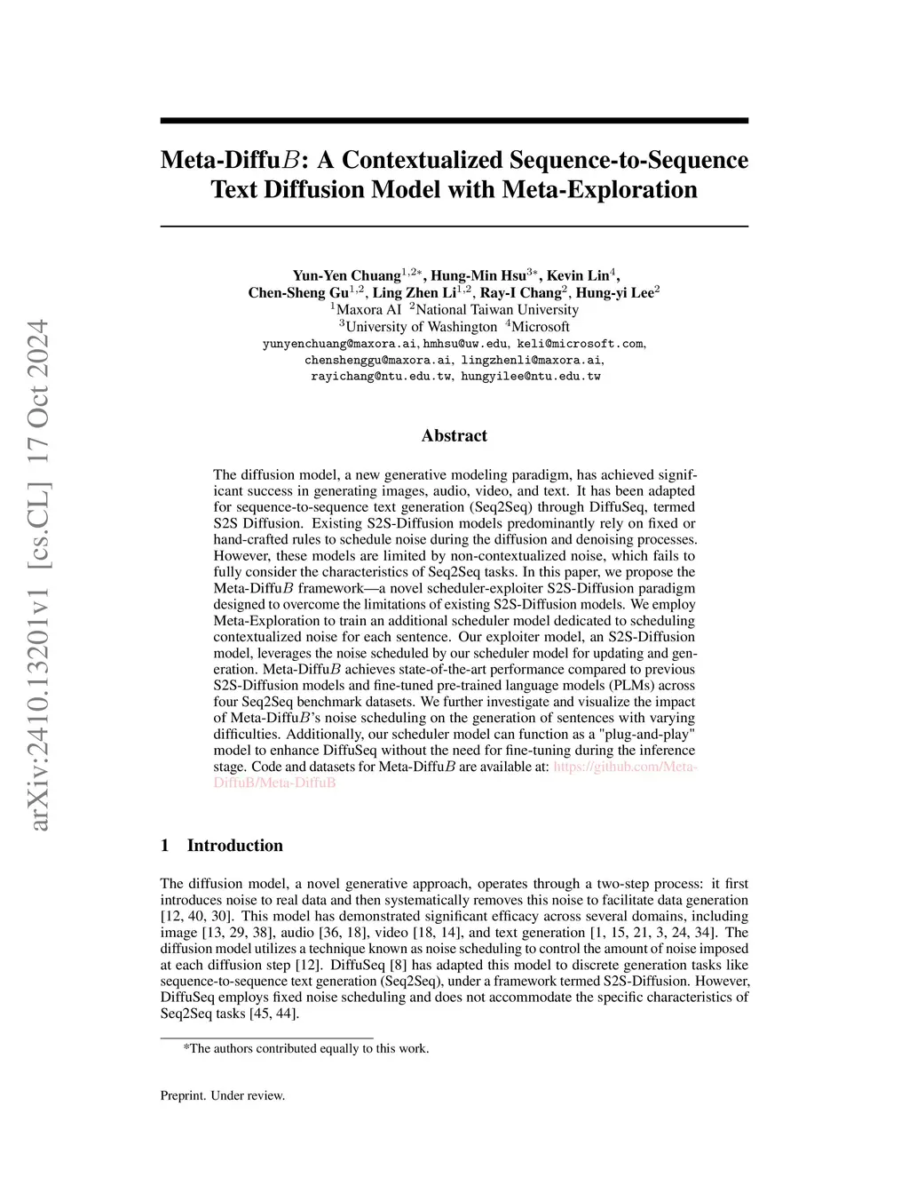 Meta-DiffuB: A Contextualized Sequence-to-Sequence Text Diffusion Model