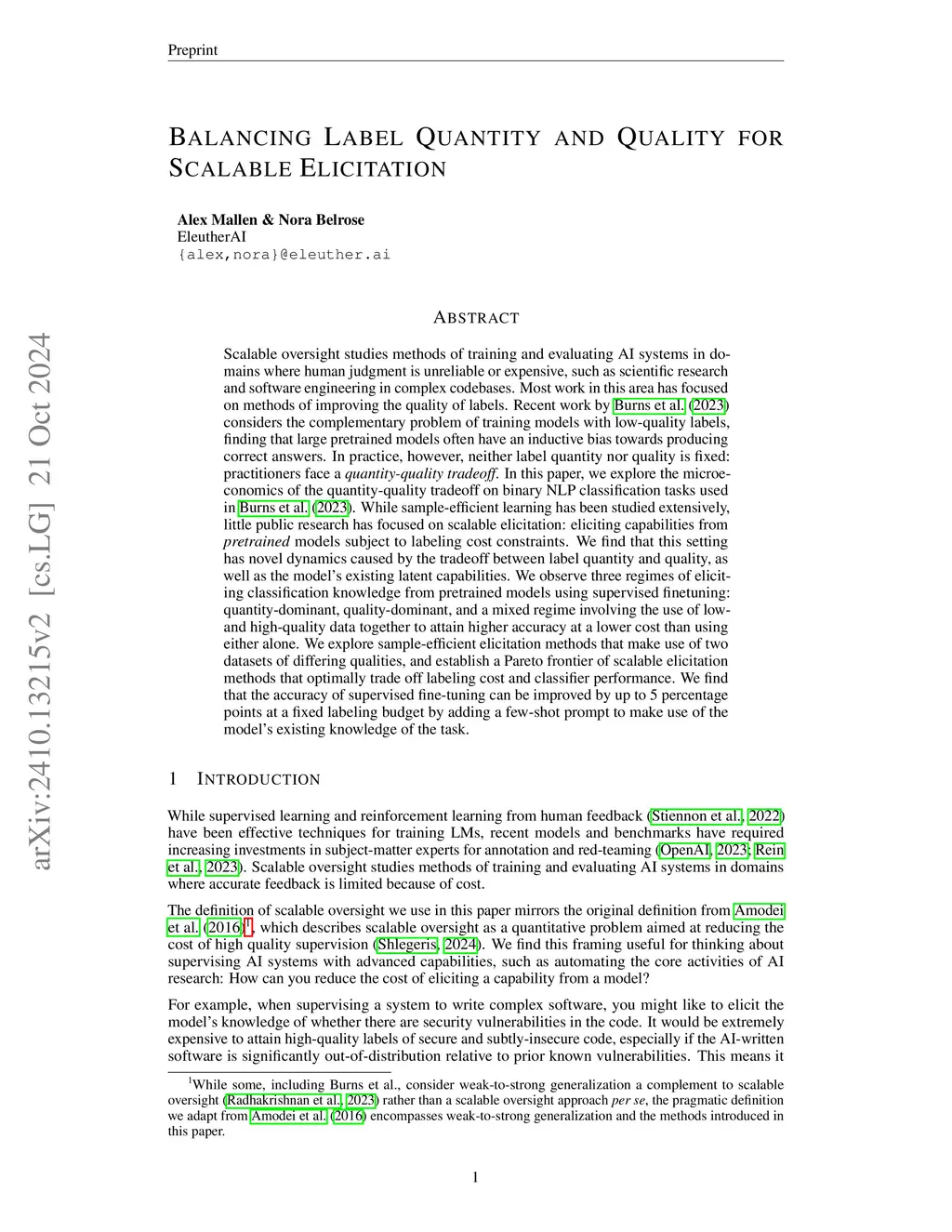 Scalable oversight studies methods of training and evaluating AI systems in domains where human judgment is unreliable or expensive, such as scientific research and software engineering in complex codebases. Most work in this area has focused on methods of improving the quality of labels. Recent work by Burns et al. (2023) considers the complementary problem of training models with low-quality labels, finding that large pretrained models often have an inductive bias towards producing correct answers. In practice, however, neither label quantity nor quality is fixed: practitioners face a quantity-quality tradeoff. In this paper, we explore the microeconomics of the quantity-quality tradeoff on binary NLP classification tasks used in Burns et al. (2023). While sample-efficient learning has been studied extensively, little public research has focused on scalable elicitation: eliciting capabilities from pretrained models subject to labeling cost constraints. We find that this setting has novel dynamics caused by the tradeoff between label quantity and quality, as well as the model's existing latent capabilities. We observe three regimes of eliciting classification knowledge from pretrained models using supervised finetuning: quantity-dominant, quality-dominant, and a mixed regime involving the use of low- and high-quality data together to attain higher accuracy at a lower cost than using either alone. We explore sample-efficient elicitation methods that make use of two datasets of differing qualities, and establish a Pareto frontier of scalable elicitation methods that optimally trade off labeling cost and classifier performance. We find that the accuracy of supervised fine-tuning can be improved by up to 5 percentage points at a fixed labeling budget by adding a few-shot prompt to make use of the model's existing knowledge of the task.