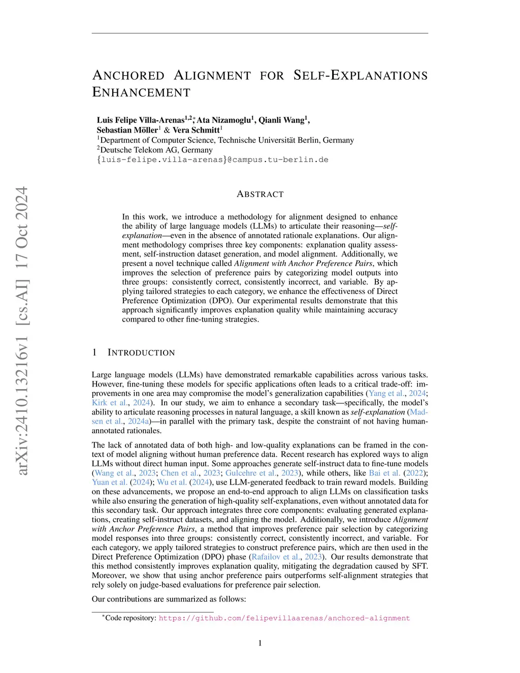 In this work, we introduce a methodology for alignment designed to enhance the ability of large language models (LLMs) to articulate their reasoning (self-explanation) even in the absence of annotated rationale explanations. Our alignment methodology comprises three key components: explanation quality assessment, self-instruction dataset generation, and model alignment. Additionally, we present a novel technique called Alignment with Anchor Preference Pairs, which improves the selection of preference pairs by categorizing model outputs into three groups: consistently correct, consistently incorrect, and variable. By applying tailored strategies to each category, we enhance the effectiveness of Direct Preference Optimization (DPO). Our experimental results demonstrate that this approach significantly improves explanation quality while maintaining accuracy compared to other fine-tuning strategies.