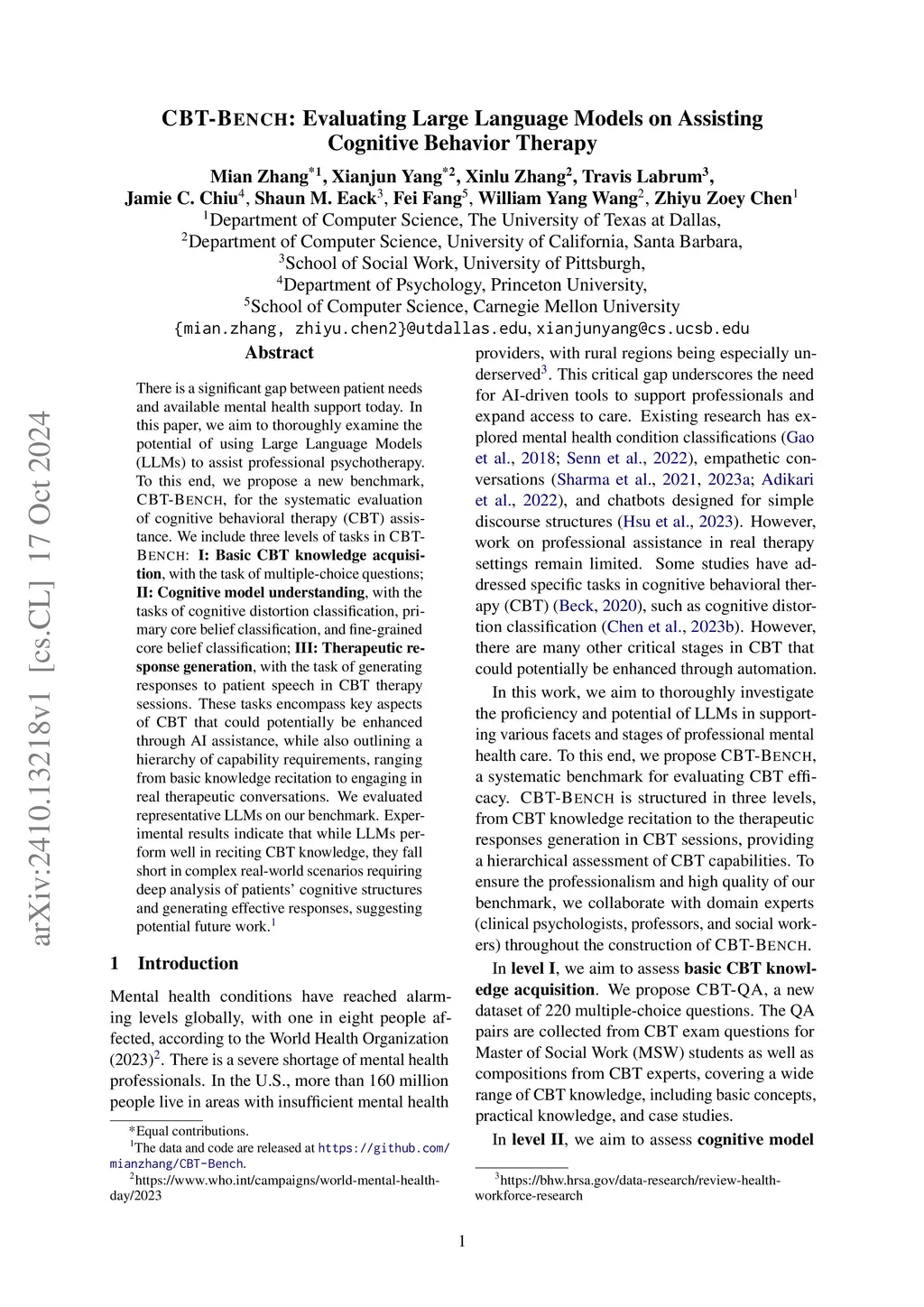 CBT-Bench: Evaluating Large Language Models on Assisting Cognitive Behavior Therapy
