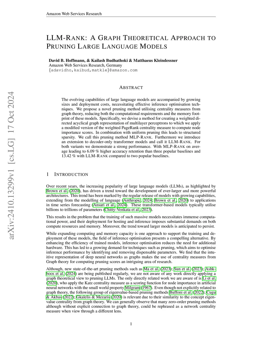 The evolving capabilities of large language models are accompanied by growing sizes and deployment costs, necessitating effective inference optimisation techniques. We propose a novel pruning method utilising centrality measures from graph theory, reducing both the computational requirements and the memory footprint of these models. Specifically, we devise a method for creating a weighted directed acyclical graph representation of multilayer perceptrons to which we apply a modified version of the weighted PageRank centrality measure to compute node importance scores. In combination with uniform pruning this leads to structured sparsity. We call this pruning method MLPRank. Furthermore we introduce an extension to decoder-only transformer models and call it LLMRank. For both variants we demonstrate a strong performance. With MLPRank on average leading to 6.09 % higher accuracy retention than three popular baselines and 13.42 % with LLMRank compared to two popular baselines.