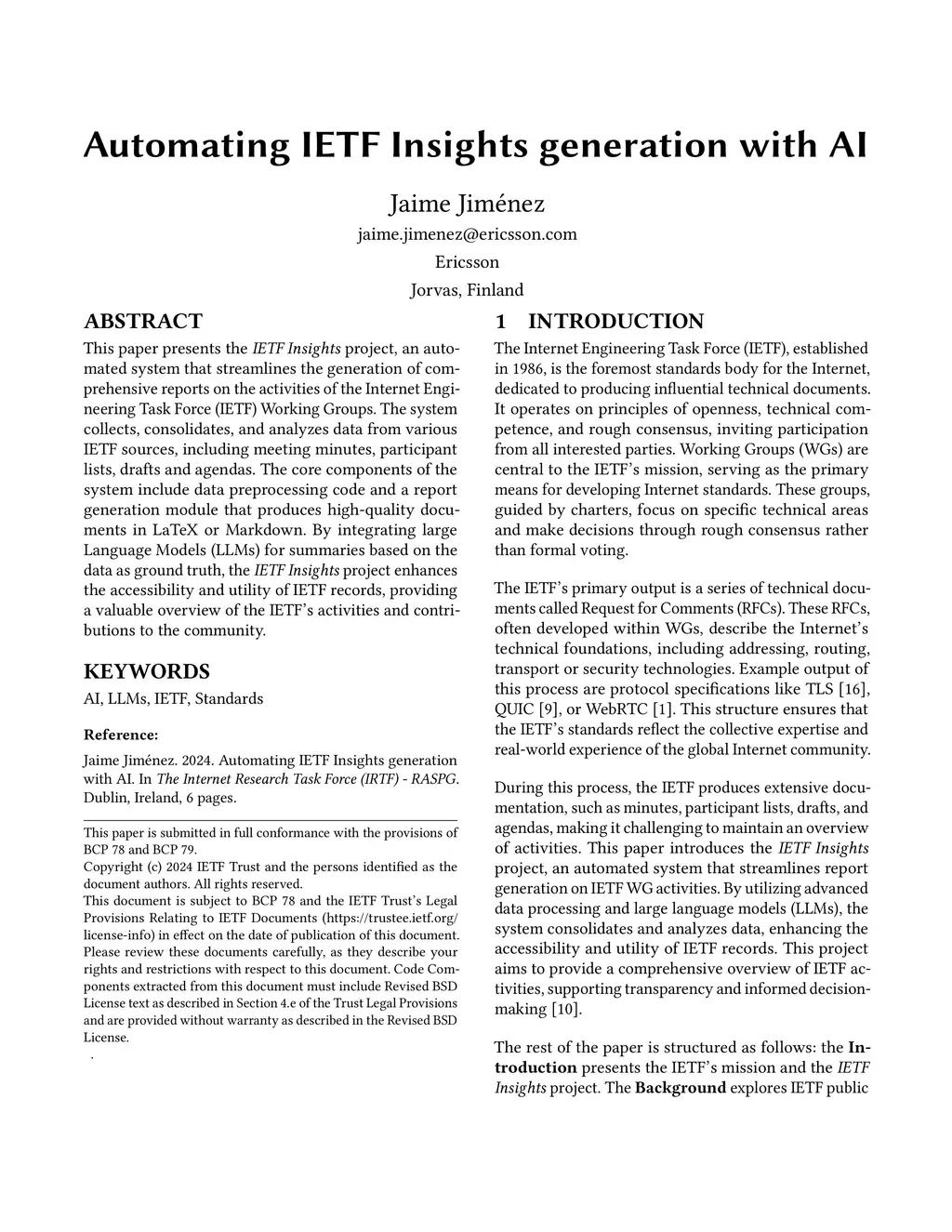 This paper presents the IETF Insights project, an automated system that streamlines the generation of comprehensive reports on the activities of the Internet Engineering Task Force (IETF) Working Groups. The system collects, consolidates, and analyzes data from various IETF sources, including meeting minutes, participant lists, drafts and agendas. The core components of the system include data preprocessing code and a report generation module that produces high-quality documents in LaTeX or Markdown. By integrating large Language Models (LLMs) for summaries based on the data as ground truth, the IETF Insights project enhances the accessibility and utility of IETF records, providing a valuable overview of the IETF's activities and contributions to the community.