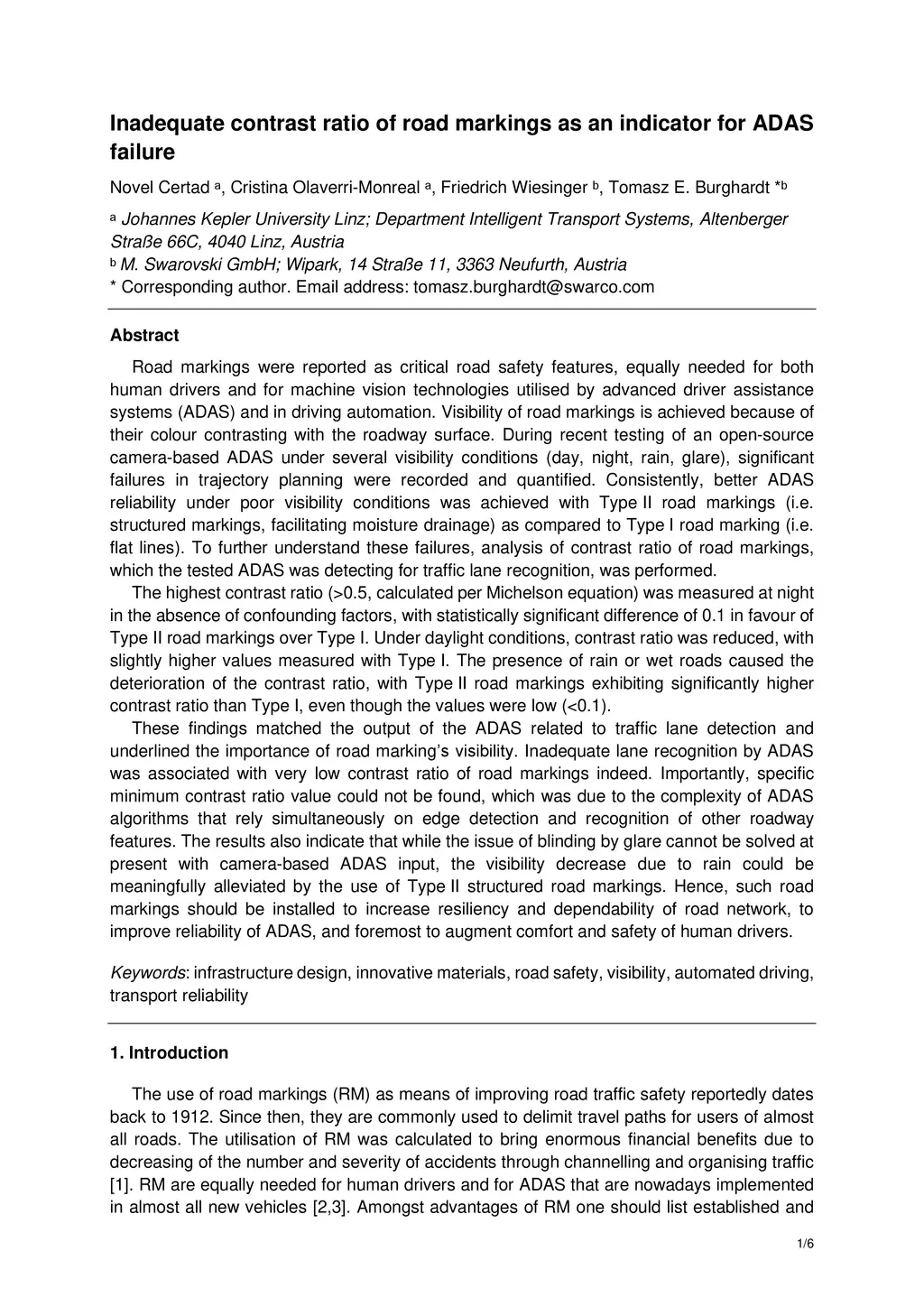 Inadequate contrast ratio of road markings as an indicator for ADAS