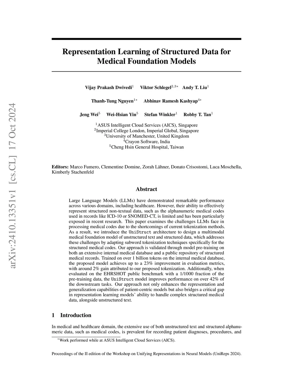 Large Language Models (LLMs) have demonstrated remarkable performance across various domains, including healthcare. However, their ability to effectively represent structured non-textual data, such as the alphanumeric medical codes used in records like ICD-10 or SNOMED-CT, is limited and has been particularly exposed in recent research. This paper examines the challenges LLMs face in processing medical codes due to the shortcomings of current tokenization methods. As a result, we introduce the UniStruct architecture to design a multimodal medical foundation model of unstructured text and structured data, which addresses these challenges by adapting subword tokenization techniques specifically for the structured medical codes. Our approach is validated through model pre-training on both an extensive internal medical database and a public repository of structured medical records. Trained on over 1 billion tokens on the internal medical database, the proposed model achieves up to a 23% improvement in evaluation metrics, with around 2% gain attributed to our proposed tokenization. Additionally, when evaluated on the EHRSHOT public benchmark with a 1/1000 fraction of the pre-training data, the UniStruct model improves performance on over 42% of the downstream tasks. Our approach not only enhances the representation and generalization capabilities of patient-centric models but also bridges a critical gap in representation learning models' ability to handle complex structured medical data, alongside unstructured text.