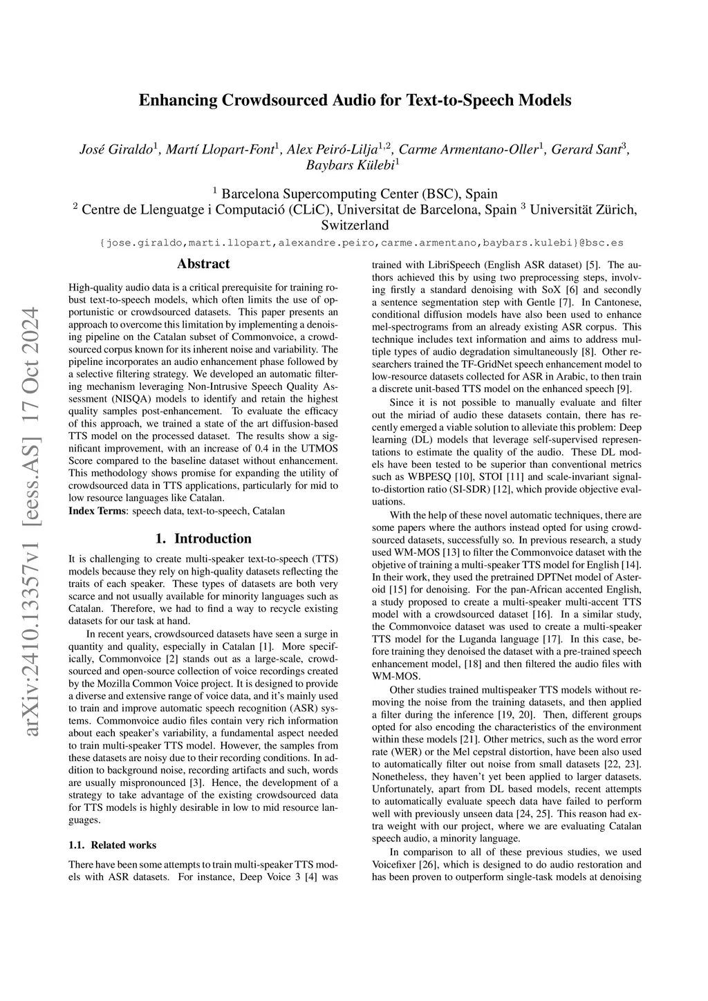 High-quality audio data is a critical prerequisite for training robust text-to-speech models, which often limits the use of opportunistic or crowdsourced datasets. This paper presents an approach to overcome this limitation by implementing a denoising pipeline on the Catalan subset of Commonvoice, a crowd-sourced corpus known for its inherent noise and variability. The pipeline incorporates an audio enhancement phase followed by a selective filtering strategy. We developed an automatic filtering mechanism leveraging Non-Intrusive Speech Quality Assessment (NISQA) models to identify and retain the highest quality samples post-enhancement. To evaluate the efficacy of this approach, we trained a state of the art diffusion-based TTS model on the processed dataset. The results show a significant improvement, with an increase of 0.4 in the UTMOS Score compared to the baseline dataset without enhancement. This methodology shows promise for expanding the utility of crowdsourced data in TTS applications, particularly for mid to low resource languages like Catalan.