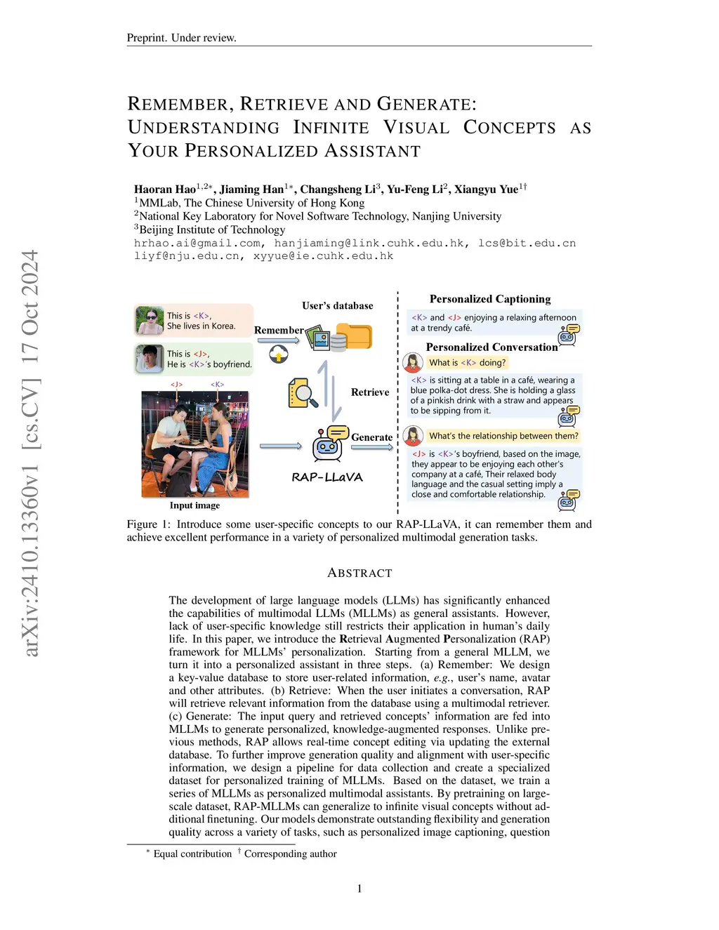 The development of large language models (LLMs) has significantly enhanced the capabilities of multimodal LLMs (MLLMs) as general assistants. However, lack of user-specific knowledge still restricts their application in human's daily life. In this paper, we introduce the Retrieval Augmented Personalization (RAP) framework for MLLMs' personalization. Starting from a general MLLM, we turn it into a personalized assistant in three steps. (a) Remember: We design a key-value database to store user-related information, e.g., user's name, avatar and other attributes. (b) Retrieve: When the user initiates a conversation, RAP will retrieve relevant information from the database using a multimodal retriever. (c) Generate: The input query and retrieved concepts' information are fed into MLLMs to generate personalized, knowledge-augmented responses. Unlike previous methods, RAP allows real-time concept editing via updating the external database. To further improve generation quality and alignment with user-specific information, we design a pipeline for data collection and create a specialized dataset for personalized training of MLLMs. Based on the dataset, we train a series of MLLMs as personalized multimodal assistants. By pretraining on large-scale dataset, RAP-MLLMs can generalize to infinite visual concepts without additional finetuning. Our models demonstrate outstanding flexibility and generation quality across a variety of tasks, such as personalized image captioning, question answering and visual recognition. The code, data and models are available atthis https URL.