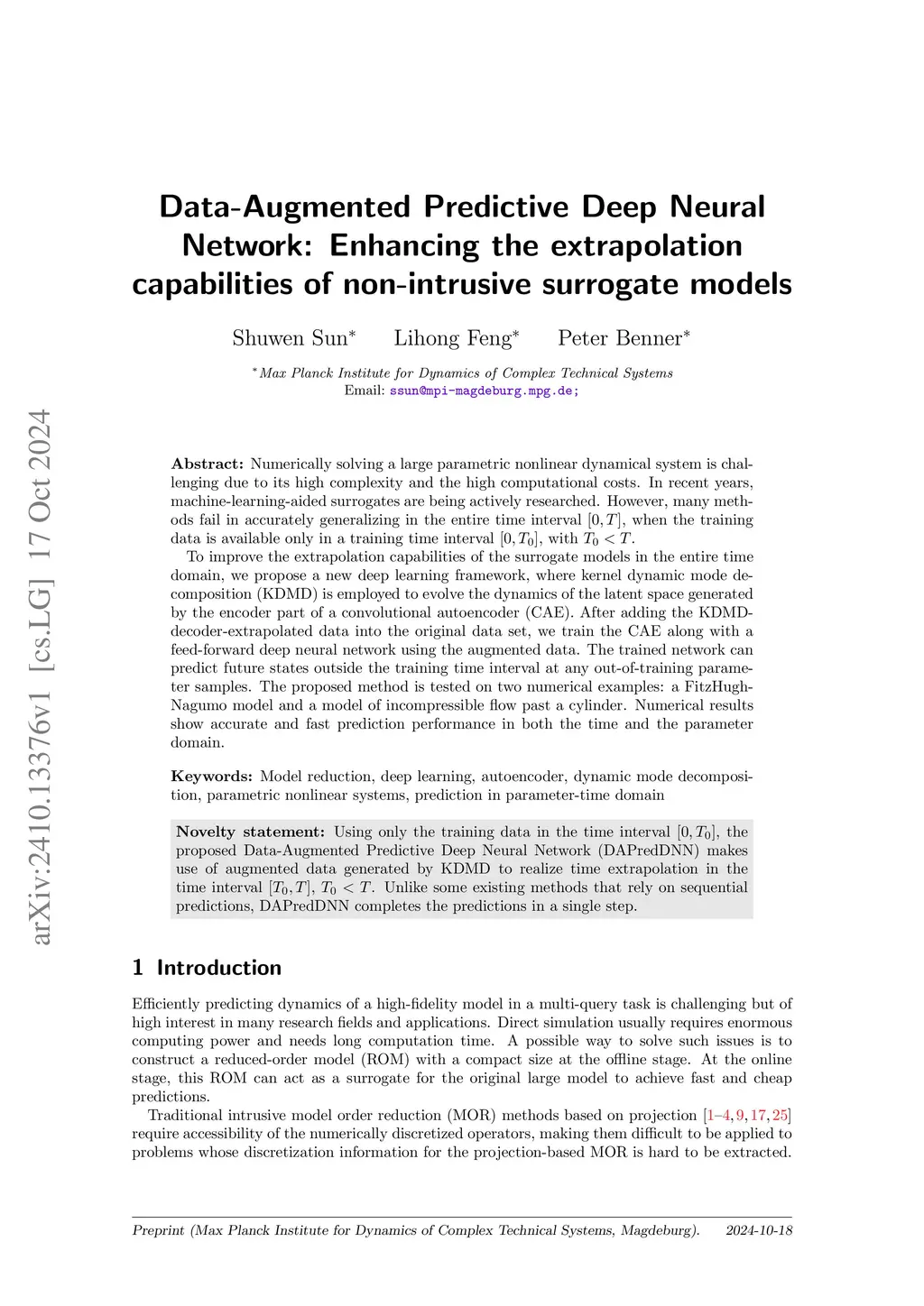 Numerically solving a large parametric nonlinear dynamical system is challenging due to its high complexity and the high computational costs. In recent years, machine-learning-aided surrogates are being actively researched. However, many methods fail in accurately generalizing in the entire time interval , when the training data is available only in a training time interval , with . To improve the extrapolation capabilities of the surrogate models in the entire time domain, we propose a new deep learning framework, where kernel dynamic mode decomposition (KDMD) is employed to evolve the dynamics of the latent space generated by the encoder part of a convolutional autoencoder (CAE). After adding the KDMD-decoder-extrapolated data into the original data set, we train the CAE along with a feed-forward deep neural network using the augmented data. The trained network can predict future states outside the training time interval at any out-of-training parameter samples. The proposed method is tested on two numerical examples: a FitzHugh-Nagumo model and a model of incompressible flow past a cylinder. Numerical results show accurate and fast prediction performance in both the time and the parameter domain.