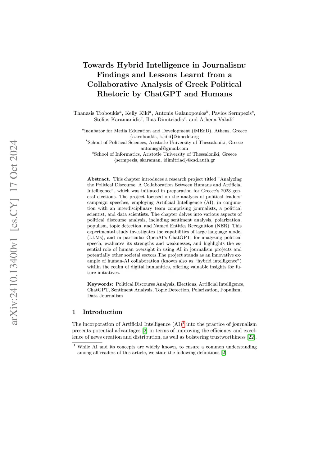 This chapter introduces a research project titled "Analyzing the Political Discourse: A Collaboration Between Humans and Artificial Intelligence", which was initiated in preparation for Greece's 2023 general elections. The project focused on the analysis of political leaders' campaign speeches, employing Artificial Intelligence (AI), in conjunction with an interdisciplinary team comprising journalists, a political scientist, and data scientists. The chapter delves into various aspects of political discourse analysis, including sentiment analysis, polarization, populism, topic detection, and Named Entities Recognition (NER). This experimental study investigates the capabilities of large language model (LLMs), and in particular OpenAI's ChatGPT, for analyzing political speech, evaluates its strengths and weaknesses, and highlights the essential role of human oversight in using AI in journalism projects and potentially other societal sectors. The project stands as an innovative example of human-AI collaboration (known also as "hybrid intelligence") within the realm of digital humanities, offering valuable insights for future initiatives.