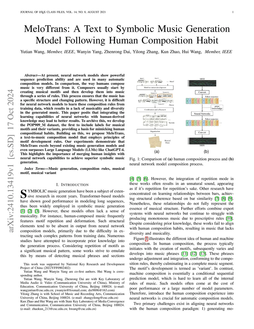 At present, neural network models show powerful sequence prediction ability and are used in many automatic composition models. In comparison, the way humans compose music is very different from it. Composers usually start by creating musical motifs and then develop them into music through a series of rules. This process ensures that the music has a specific structure and changing pattern. However, it is difficult for neural network models to learn these composition rules from training data, which results in a lack of musicality and diversity in the generated music. This paper posits that integrating the learning capabilities of neural networks with human-derived knowledge may lead to better results. To archive this, we develop the POP909M dataset, the first to include labels for musical motifs and their variants, providing a basis for mimicking human compositional habits. Building on this, we propose MeloTrans, a text-to-music composition model that employs principles of motif development rules. Our experiments demonstrate that MeloTrans excels beyond existing music generation models and even surpasses Large Language Models (LLMs) like ChatGPT-4. This highlights the importance of merging human insights with neural network capabilities to achieve superior symbolic music generation.