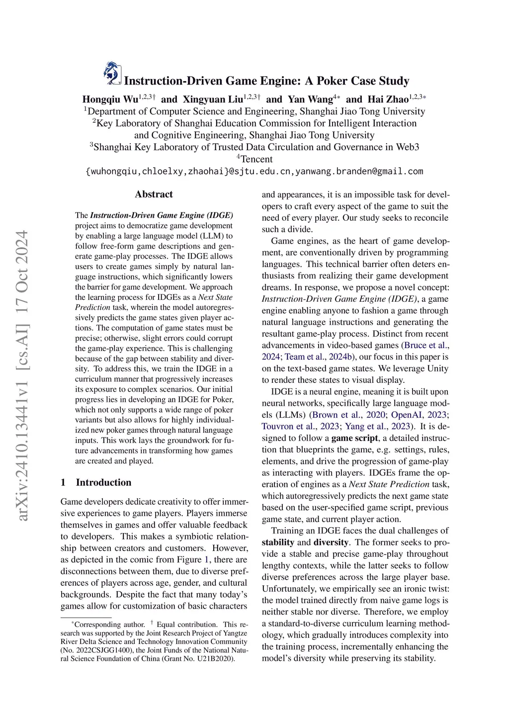The Instruction-Driven Game Engine (IDGE) project aims to democratize game development by enabling a large language model (LLM) to follow free-form game descriptions and generate game-play processes. The IDGE allows users to create games simply by natural language instructions, which significantly lowers the barrier for game development. We approach the learning process for IDGEs as a Next State Prediction task, wherein the model autoregressively predicts the game states given player actions. The computation of game states must be precise; otherwise, slight errors could corrupt the game-play experience. This is challenging because of the gap between stability and diversity. To address this, we train the IDGE in a curriculum manner that progressively increases its exposure to complex scenarios. Our initial progress lies in developing an IDGE for Poker, which not only supports a wide range of poker variants but also allows for highly individualized new poker games through natural language inputs. This work lays the groundwork for future advancements in transforming how games are created and played.