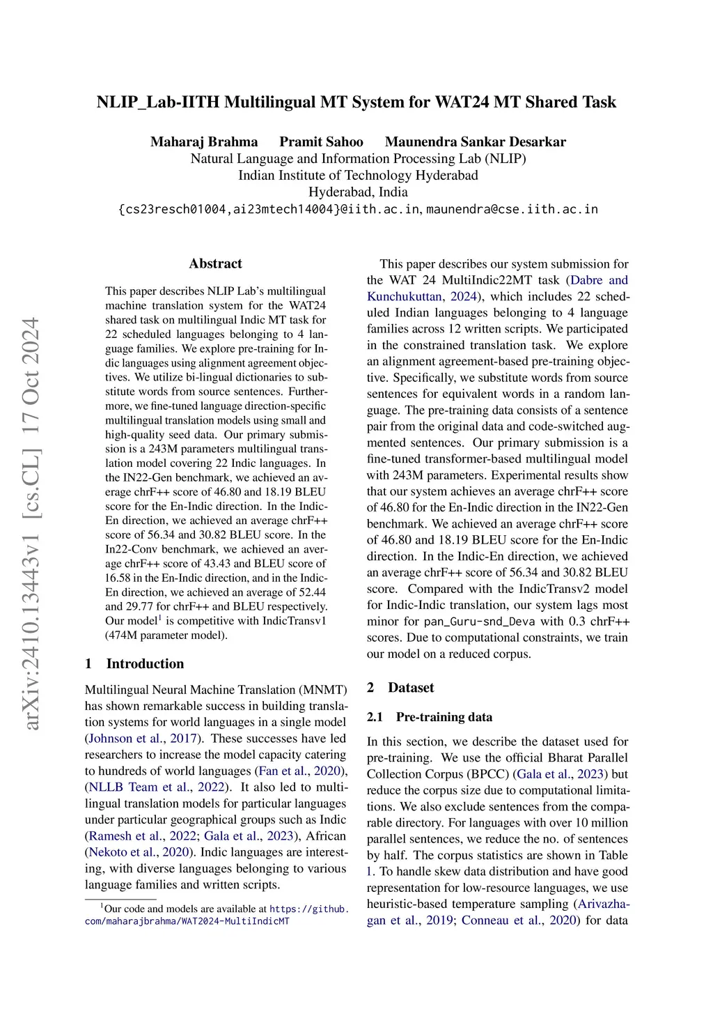 This paper describes NLIP Lab's multilingual machine translation system for the WAT24 shared task on multilingual Indic MT task for 22 scheduled languages belonging to 4 language families. We explore pre-training for Indic languages using alignment agreement objectives. We utilize bi-lingual dictionaries to substitute words from source sentences. Furthermore, we fine-tuned language direction-specific multilingual translation models using small and high-quality seed data. Our primary submission is a 243M parameters multilingual translation model covering 22 Indic languages. In the IN22-Gen benchmark, we achieved an average chrF++ score of 46.80 and 18.19 BLEU score for the En-Indic direction. In the Indic-En direction, we achieved an average chrF++ score of 56.34 and 30.82 BLEU score. In the In22-Conv benchmark, we achieved an average chrF++ score of 43.43 and BLEU score of 16.58 in the En-Indic direction, and in the Indic-En direction, we achieved an average of 52.44 and 29.77 for chrF++ and BLEU respectively. Our model\footnote{Our code and models are available at \url{https://github.com/maharajbrahma/WAT2024-MultiIndicMT}} is competitive with IndicTransv1 (474M parameter model).