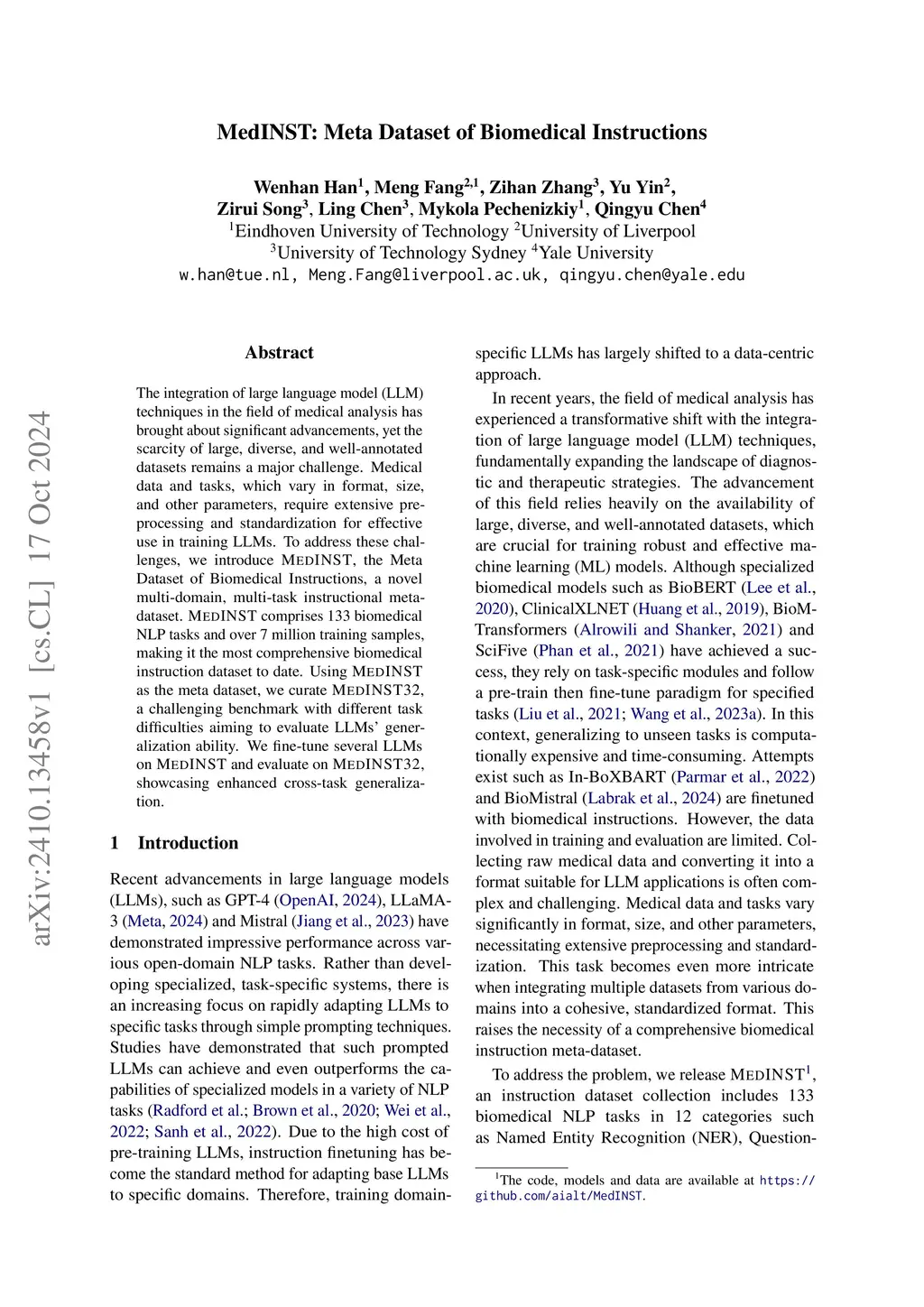 The integration of large language model (LLM) techniques in the field of medical analysis has brought about significant advancements, yet the scarcity of large, diverse, and well-annotated datasets remains a major challenge. Medical data and tasks, which vary in format, size, and other parameters, require extensive preprocessing and standardization for effective use in training LLMs. To address these challenges, we introduce MedINST, the Meta Dataset of Biomedical Instructions, a novel multi-domain, multi-task instructional meta-dataset. MedINST comprises 133 biomedical NLP tasks and over 7 million training samples, making it the most comprehensive biomedical instruction dataset to date. Using MedINST as the meta dataset, we curate MedINST32, a challenging benchmark with different task difficulties aiming to evaluate LLMs' generalization ability. We fine-tune several LLMs on MedINST and evaluate on MedINST32, showcasing enhanced cross-task generalization.