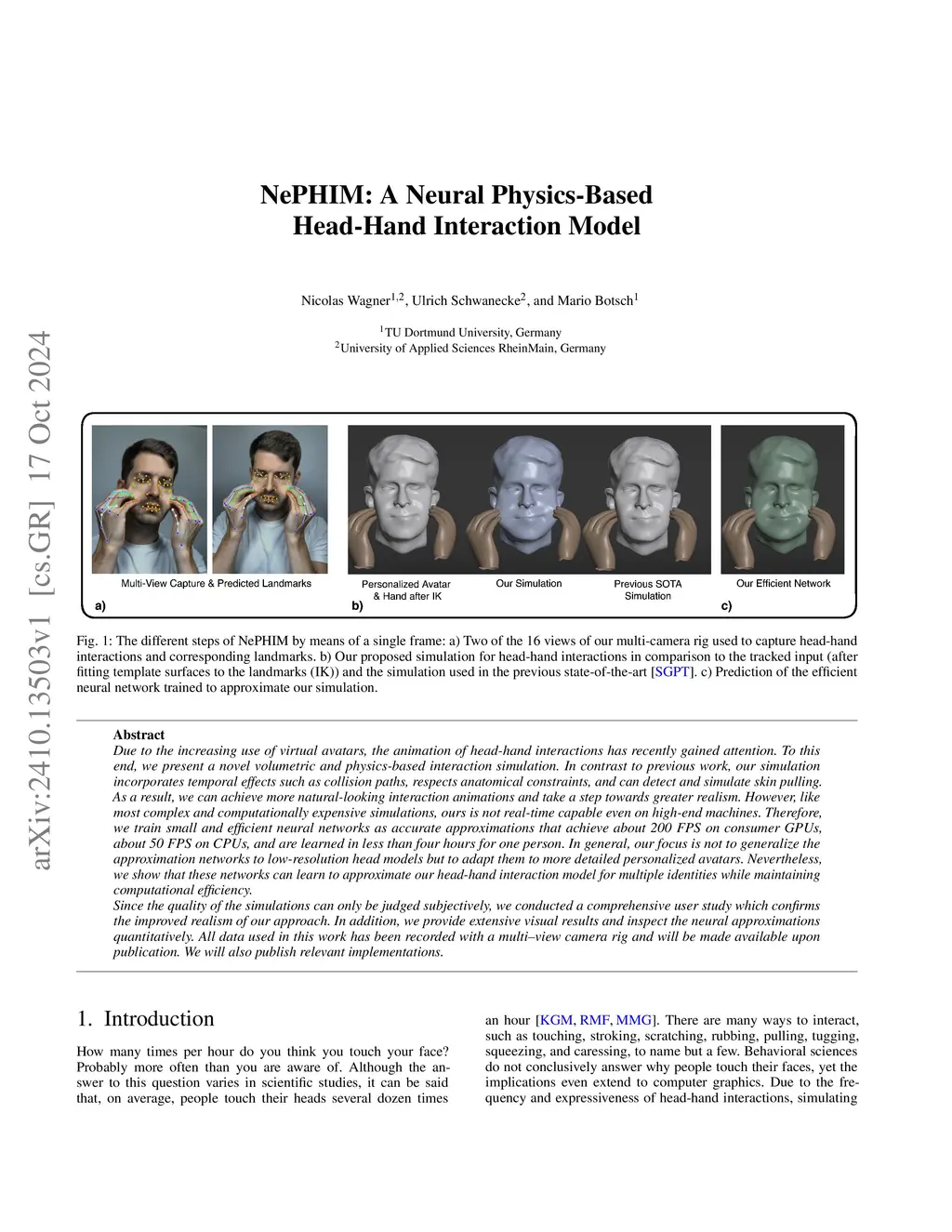 Due to the increasing use of virtual avatars, the animation of head-hand interactions has recently gained attention. To this end, we present a novel volumetric and physics-based interaction simulation. In contrast to previous work, our simulation incorporates temporal effects such as collision paths, respects anatomical constraints, and can detect and simulate skin pulling. As a result, we can achieve more natural-looking interaction animations and take a step towards greater realism. However, like most complex and computationally expensive simulations, ours is not real-time capable even on high-end machines. Therefore, we train small and efficient neural networks as accurate approximations that achieve about 200 FPS on consumer GPUs, about 50 FPS on CPUs, and are learned in less than four hours for one person. In general, our focus is not to generalize the approximation networks to low-resolution head models but to adapt them to more detailed personalized avatars. Nevertheless, we show that these networks can learn to approximate our head-hand interaction model for multiple identities while maintaining computational efficiency. Since the quality of the simulations can only be judged subjectively, we conducted a comprehensive user study which confirms the improved realism of our approach. In addition, we provide extensive visual results and inspect the neural approximations quantitatively. All data used in this work has been recorded with a multi--view camera rig and will be made available upon publication. We will also publish relevant implementations.