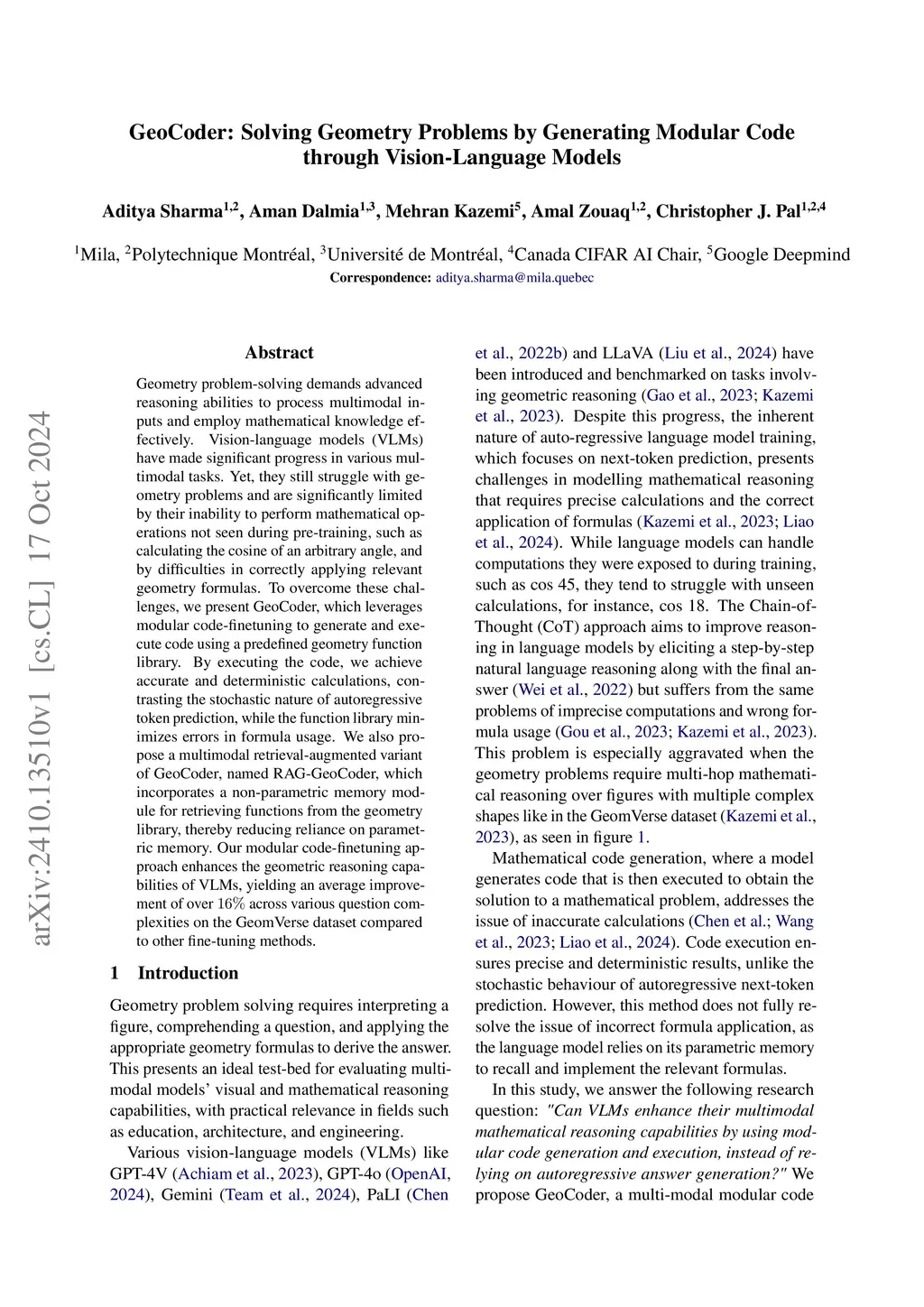 Geometry problem-solving demands advanced reasoning abilities to process multimodal inputs and employ mathematical knowledge effectively. Vision-language models (VLMs) have made significant progress in various multimodal tasks. Yet, they still struggle with geometry problems and are significantly limited by their inability to perform mathematical operations not seen during pre-training, such as calculating the cosine of an arbitrary angle, and by difficulties in correctly applying relevant geometry formulas. To overcome these challenges, we present GeoCoder, which leverages modular code-finetuning to generate and execute code using a predefined geometry function library. By executing the code, we achieve accurate and deterministic calculations, contrasting the stochastic nature of autoregressive token prediction, while the function library minimizes errors in formula usage. We also propose a multimodal retrieval-augmented variant of GeoCoder, named RAG-GeoCoder, which incorporates a non-parametric memory module for retrieving functions from the geometry library, thereby reducing reliance on parametric memory. Our modular code-finetuning approach enhances the geometric reasoning capabilities of VLMs, yielding an average improvement of over 16% across various question complexities on the GeomVerse dataset compared to other finetuning methods.
