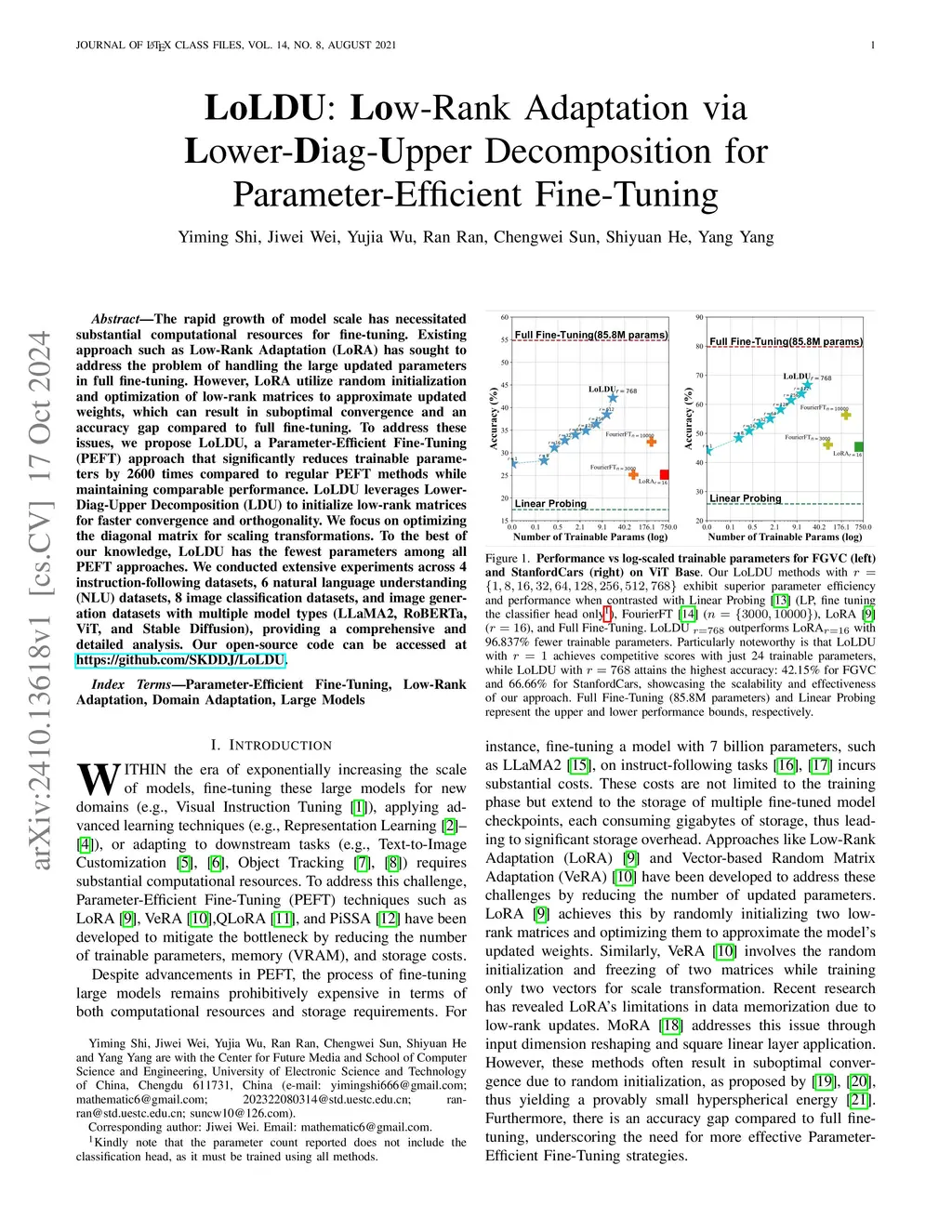The rapid growth of model scale has necessitated substantial computational resources for fine-tuning. Existing approach such as Low-Rank Adaptation (LoRA) has sought to address the problem of handling the large updated parameters in full fine-tuning. However, LoRA utilize random initialization and optimization of low-rank matrices to approximate updated weights, which can result in suboptimal convergence and an accuracy gap compared to full fine-tuning. To address these issues, we propose LoLDU, a Parameter-Efficient Fine-Tuning (PEFT) approach that significantly reduces trainable parameters by 2600 times compared to regular PEFT methods while maintaining comparable performance. LoLDU leverages Lower-Diag-Upper Decomposition (LDU) to initialize low-rank matrices for faster convergence and orthogonality. We focus on optimizing the diagonal matrix for scaling transformations. To the best of our knowledge, LoLDU has the fewest parameters among all PEFT approaches. We conducted extensive experiments across 4 instruction-following datasets, 6 natural language understanding (NLU) datasets, 8 image classification datasets, and image generation datasets with multiple model types (LLaMA2, RoBERTa, ViT, and Stable Diffusion), providing a comprehensive and detailed analysis. Our open-source code can be accessed at \href{https://github.com/SKDDJ/LoLDU}{https://github.com/SKDDJ/LoLDU}.