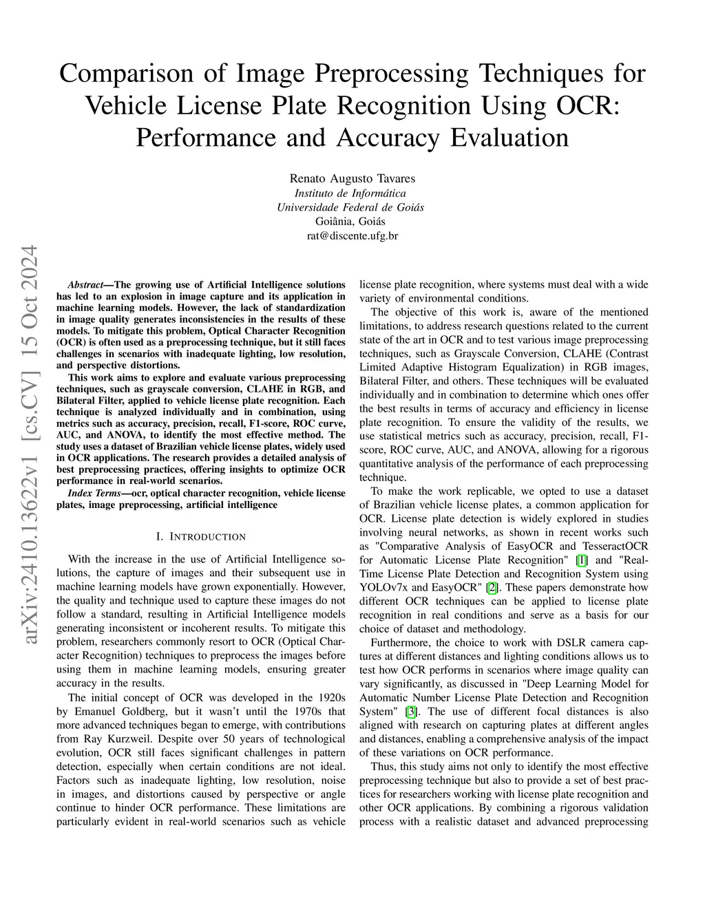The growing use of Artificial Intelligence solutions has led to an explosion in image capture and its application in machine learning models. However, the lack of standardization in image quality generates inconsistencies in the results of these models. To mitigate this problem, Optical Character Recognition (OCR) is often used as a preprocessing technique, but it still faces challenges in scenarios with inadequate lighting, low resolution, and perspective distortions. This work aims to explore and evaluate various preprocessing techniques, such as grayscale conversion, CLAHE in RGB, and Bilateral Filter, applied to vehicle license plate recognition. Each technique is analyzed individually and in combination, using metrics such as accuracy, precision, recall, F1-score, ROC curve, AUC, and ANOVA, to identify the most effective method. The study uses a dataset of Brazilian vehicle license plates, widely used in OCR applications. The research provides a detailed analysis of best preprocessing practices, offering insights to optimize OCR performance in real-world scenarios.