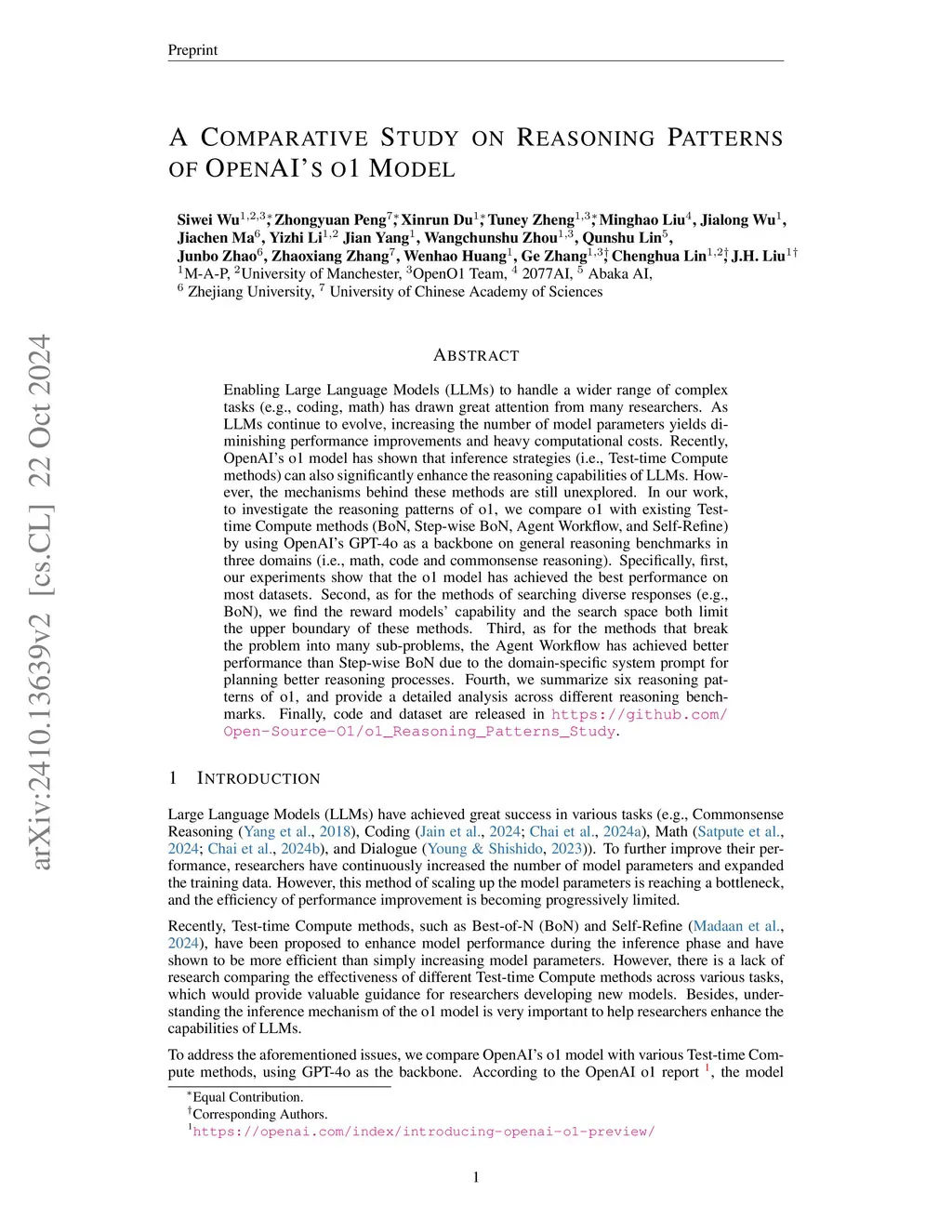 Enabling Large Language Models (LLMs) to handle a wider range of complex tasks (e.g., coding, math) has drawn great attention from many researchers. As LLMs continue to evolve, merely increasing the number of model parameters yields diminishing performance improvements and heavy computational costs. Recently, OpenAI's o1 model has shown that inference strategies (i.e., Test-time Compute methods) can also significantly enhance the reasoning capabilities of LLMs. However, the mechanisms behind these methods are still unexplored. In our work, to investigate the reasoning patterns of o1, we compare o1 with existing Test-time Compute methods (BoN, Step-wise BoN, Agent Workflow, and Self-Refine) by using OpenAI's GPT-4o as a backbone on general reasoning benchmarks in three domains (i.e., math, coding, commonsense reasoning). Specifically, first, our experiments show that the o1 model has achieved the best performance on most datasets. Second, as for the methods of searching diverse responses (e.g., BoN), we find the reward models' capability and the search space both limit the upper boundary of these methods. Third, as for the methods that break the problem into many sub-problems, the Agent Workflow has achieved better performance than Step-wise BoN due to the domain-specific system prompt for planning better reasoning processes. Fourth, it is worth mentioning that we have summarized six reasoning patterns of o1, and provided a detailed analysis on several reasoning benchmarks.
