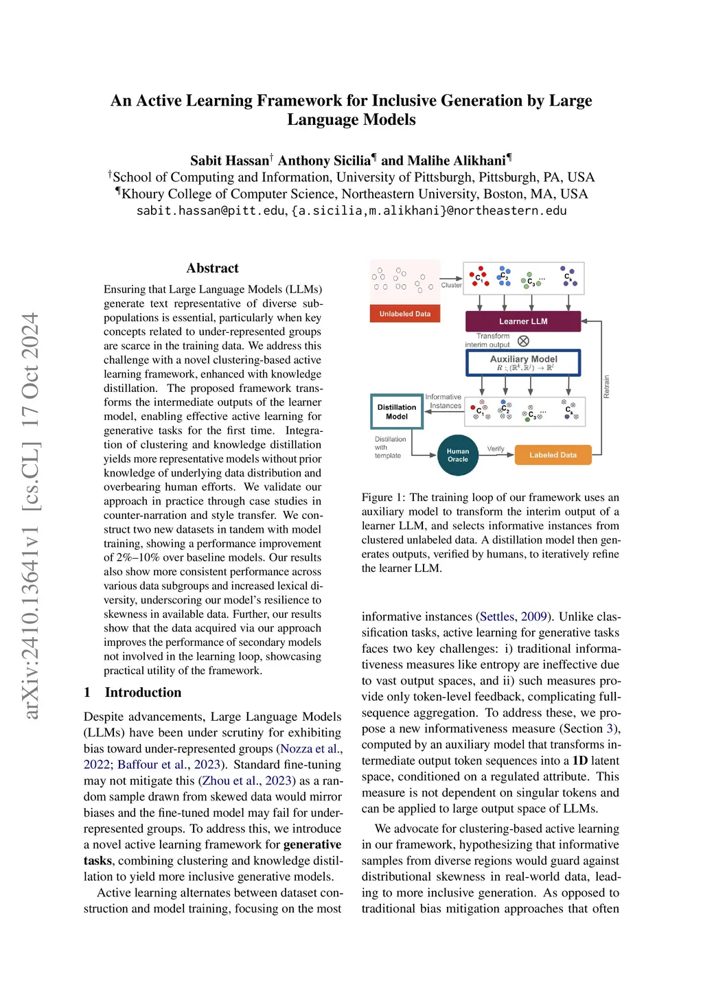 Ensuring that Large Language Models (LLMs) generate text representative of diverse sub-populations is essential, particularly when key concepts related to under-represented groups are scarce in the training data. We address this challenge with a novel clustering-based active learning framework, enhanced with knowledge distillation. The proposed framework transforms the intermediate outputs of the learner model, enabling effective active learning for generative tasks for the first time. Integration of clustering and knowledge distillation yields more representative models without prior knowledge of underlying data distribution and overbearing human efforts. We validate our approach in practice through case studies in counter-narration and style transfer. We construct two new datasets in tandem with model training, showing a performance improvement of 2%-10% over baseline models. Our results also show more consistent performance across various data subgroups and increased lexical diversity, underscoring our model's resilience to skewness in available data. Further, our results show that the data acquired via our approach improves the performance of secondary models not involved in the learning loop, showcasing practical utility of the framework.