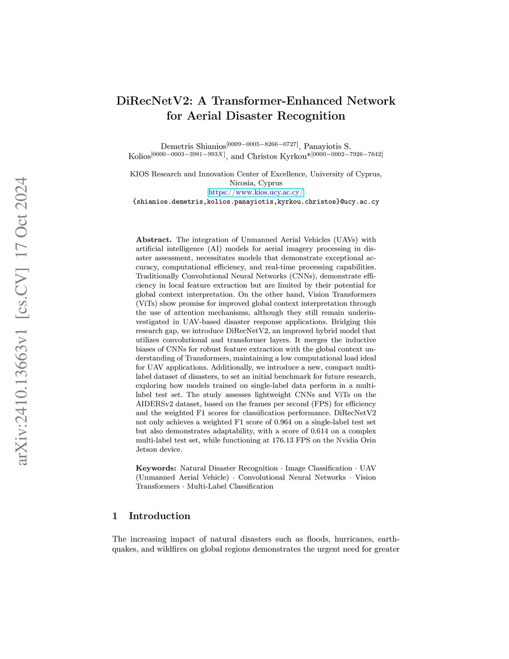 The integration of Unmanned Aerial Vehicles (UAVs) with artificial intelligence (AI) models for aerial imagery processing in disaster assessment, necessitates models that demonstrate exceptional accuracy, computational efficiency, and real-time processing capabilities. Traditionally Convolutional Neural Networks (CNNs), demonstrate efficiency in local feature extraction but are limited by their potential for global context interpretation. On the other hand, Vision Transformers (ViTs) show promise for improved global context interpretation through the use of attention mechanisms, although they still remain underinvestigated in UAV-based disaster response applications. Bridging this research gap, we introduce DiRecNetV2, an improved hybrid model that utilizes convolutional and transformer layers. It merges the inductive biases of CNNs for robust feature extraction with the global context understanding of Transformers, maintaining a low computational load ideal for UAV applications. Additionally, we introduce a new, compact multi-label dataset of disasters, to set an initial benchmark for future research, exploring how models trained on single-label data perform in a multi-label test set. The study assesses lightweight CNNs and ViTs on the AIDERSv2 dataset, based on the frames per second (FPS) for efficiency and the weighted F1 scores for classification performance. DiRecNetV2 not only achieves a weighted F1 score of 0.964 on a single-label test set but also demonstrates adaptability, with a score of 0.614 on a complex multi-label test set, while functioning at 176.13 FPS on the Nvidia Orin Jetson device.