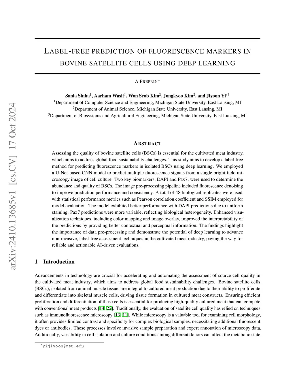 Assessing the quality of bovine satellite cells (BSCs) is essential for the cultivated meat industry, which aims to address global food sustainability challenges. This study aims to develop a label-free method for predicting fluorescence markers in isolated BSCs using deep learning. We employed a U-Net-based CNN model to predict multiple fluorescence signals from a single bright-field microscopy image of cell culture. Two key biomarkers, DAPI and Pax7, were used to determine the abundance and quality of BSCs. The image pre-processing pipeline included fluorescence denoising to improve prediction performance and consistency. A total of 48 biological replicates were used, with statistical performance metrics such as Pearson correlation coefficient and SSIM employed for model evaluation. The model exhibited better performance with DAPI predictions due to uniform staining. Pax7 predictions were more variable, reflecting biological heterogeneity. Enhanced visualization techniques, including color mapping and image overlay, improved the interpretability of the predictions by providing better contextual and perceptual information. The findings highlight the importance of data pre-processing and demonstrate the potential of deep learning to advance non-invasive, label-free assessment techniques in the cultivated meat industry, paving the way for reliable and actionable AI-driven evaluations.