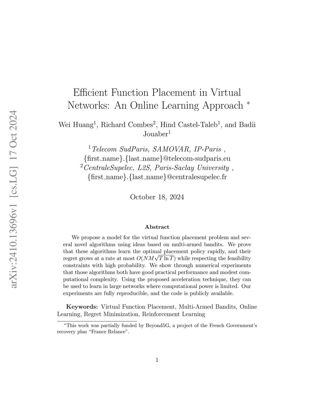 We study the placement of virtual functions aimed at minimizing the cost. We propose a novel algorithm, using ideas based on multi-armed bandits. We prove that these algorithms learn the optimal placement policy rapidly, and their regret grows at a rate at most while respecting the feasibility constraints with high probability, where is total time slots, is the number of classes of function and is the number of computation nodes. We show through numerical experiments that the proposed algorithm both has good practical performance and modest computational complexity. We propose an acceleration technique that allows the algorithm to achieve good performance also in large networks where computational power is limited. Our experiments are fully reproducible, and the code is publicly available.