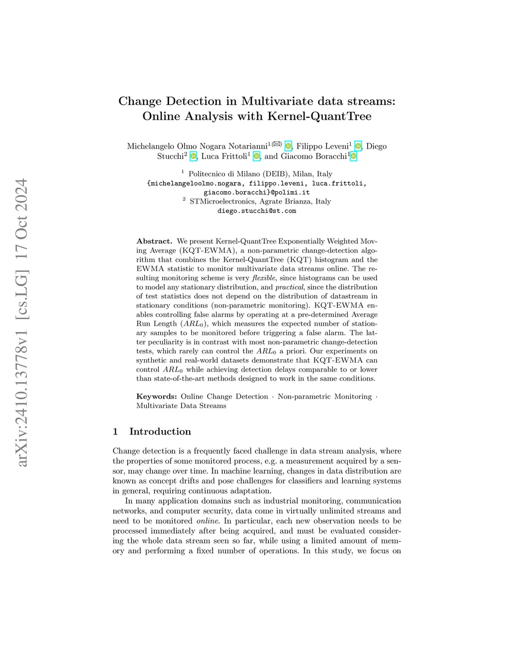 We present Kernel-QuantTree Exponentially Weighted Moving Average (KQT-EWMA), a non-parametric change-detection algorithm that combines the Kernel-QuantTree (KQT) histogram and the EWMA statistic to monitor multivariate data streams online. The resulting monitoring scheme is very flexible, since histograms can be used to model any stationary distribution, and practical, since the distribution of test statistics does not depend on the distribution of datastream in stationary conditions (non-parametric monitoring). KQT-EWMA enables controlling false alarms by operating at a pre-determined Average Run Length (), which measures the expected number of stationary samples to be monitored before triggering a false alarm. The latter peculiarity is in contrast with most non-parametric change-detection tests, which rarely can control the a priori. Our experiments on synthetic and real-world datasets demonstrate that KQT-EWMA can control while achieving detection delays comparable to or lower than state-of-the-art methods designed to work in the same conditions.
