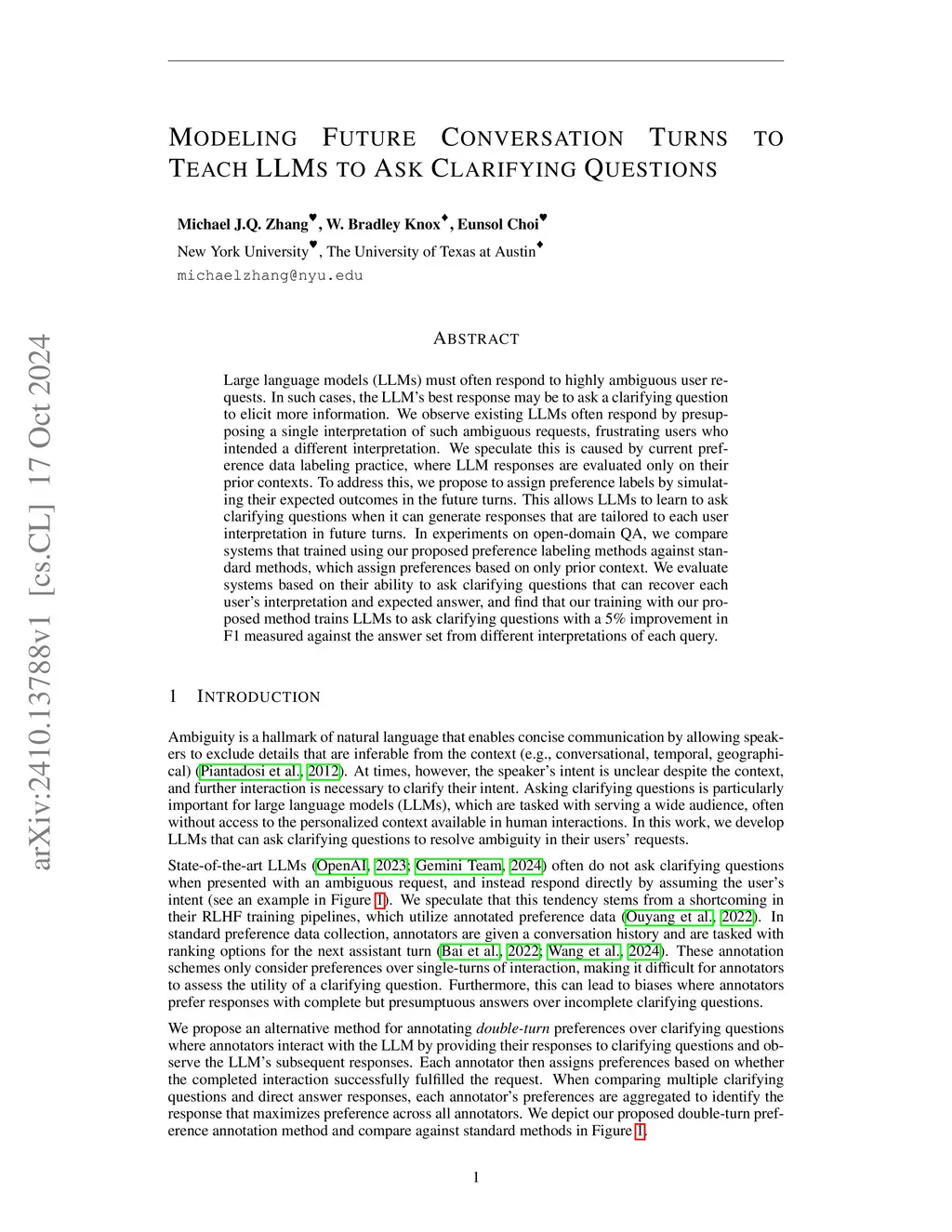 Large language models (LLMs) must often respond to highly ambiguous user requests. In such cases, the LLM's best response may be to ask a clarifying question to elicit more information. Existing LLMs often respond by presupposing a single interpretation of such ambiguous requests, frustrating users who intended a different interpretation. We speculate this is caused by current preference data labeling practice, where LLM responses are evaluated only on their prior contexts. To address this, we assign preference labels by simulating their expected outcomes in future turns. This allows LLMs to learn to ask clarifying questions when it can generate responses that are tailored to each user interpretation in future turns. On open-domain QA datasets with multiple annotations, we evaluate systems based on their ability to ask clarifying questions to recover each user's interpretation and expected answer. We compare systems trained using our proposed preference labeling methods against standard methods, which assign preferences based on only prior context. Our method achieves a 5% improvement in F1 measured against the answer set from different interpretations of each query, showing the value of modeling future conversation turns. We further demonstrate that our method can be used to train models to judiciously determine when to ask clarifying questions, directly answering the question when clarification is unnecessary. In our experiments, we find that our method achieves a 3% improvement in accuracy of such judgments over existing methods.