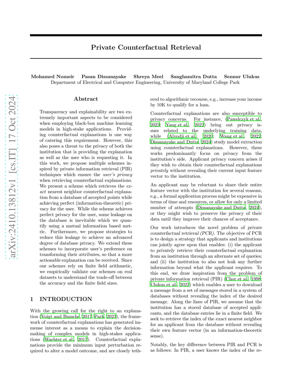 Transparency and explainability are two extremely important aspects to be considered when employing black-box machine learning models in high-stake applications. Providing counterfactual explanations is one way of fulfilling this requirement. However, this also poses a threat to the privacy of both the institution that is providing the explanation as well as the user who is requesting it. In this work, we propose multiple schemes inspired by private information retrieval (PIR) techniques which ensure the \emph{user's privacy} when retrieving counterfactual explanations. We present a scheme which retrieves the \emph{exact} nearest neighbor counterfactual explanation from a database of accepted points while achieving perfect (information-theoretic) privacy for the user. While the scheme achieves perfect privacy for the user, some leakage on the database is inevitable which we quantify using a mutual information based metric. Furthermore, we propose strategies to reduce this leakage to achieve an advanced degree of database privacy. We extend these schemes to incorporate user's preference on transforming their attributes, so that a more actionable explanation can be received. Since our schemes rely on finite field arithmetic, we empirically validate our schemes on real datasets to understand the trade-off between the accuracy and the finite field sizes. Finally, we present numerical results to support our theoretical findings, and compare the database leakage of the proposed schemes.