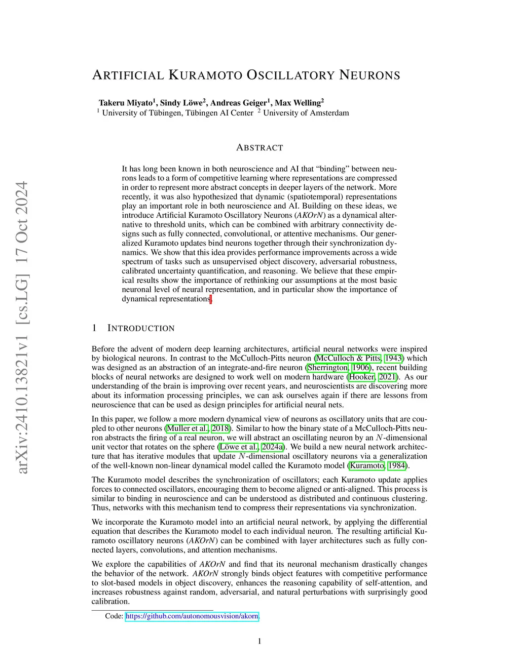 It has long been known in both neuroscience and AI that ``binding'' between neurons leads to a form of competitive learning where representations are compressed in order to represent more abstract concepts in deeper layers of the network. More recently, it was also hypothesized that dynamic (spatiotemporal) representations play an important role in both neuroscience and AI. Building on these ideas, we introduce Artificial Kuramoto Oscillatory Neurons (AKOrN) as a dynamical alternative to threshold units, which can be combined with arbitrary connectivity designs such as fully connected, convolutional, or attentive mechanisms. Our generalized Kuramoto updates bind neurons together through their synchronization dynamics. We show that this idea provides performance improvements across a wide spectrum of tasks such as unsupervised object discovery, adversarial robustness, calibrated uncertainty quantification, and reasoning. We believe that these empirical results show the importance of rethinking our assumptions at the most basic neuronal level of neural representation, and in particular show the importance of dynamical representations. Code:this https URLProject page:this https URL