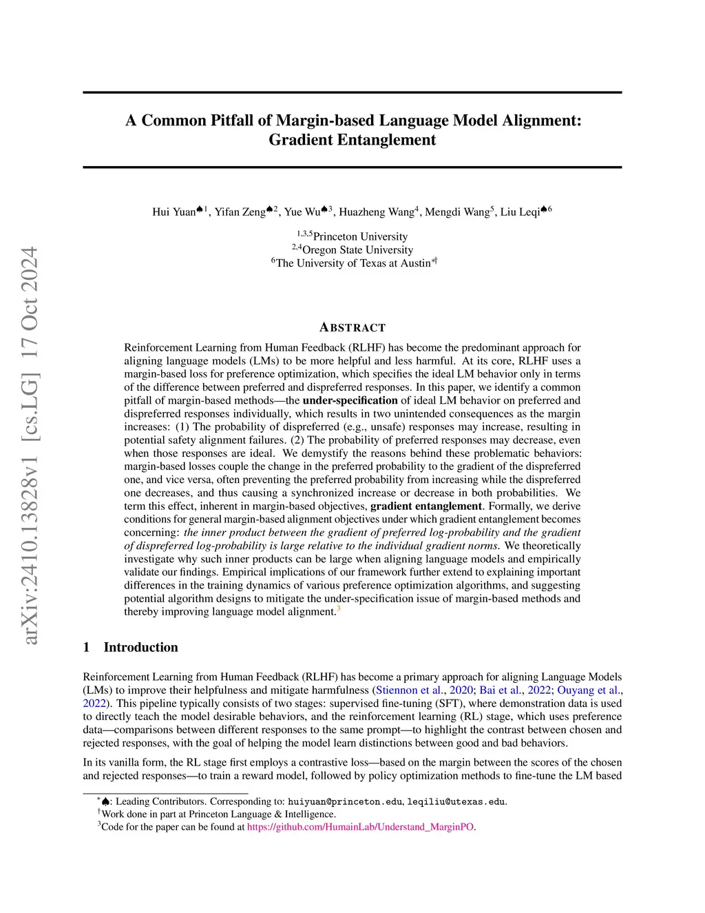 Reinforcement Learning from Human Feedback (RLHF) has become the predominant approach for language model (LM) alignment. At its core, RLHF uses a margin-based loss for preference optimization, specifying ideal LM behavior only by the difference between preferred and dispreferred responses. In this paper, we identify a common pitfall of margin-based methods -- the under-specification of ideal LM behavior on preferred and dispreferred responses individually, which leads to two unintended consequences as the margin increases: (1) The probability of dispreferred (e.g., unsafe) responses may increase, resulting in potential safety alignment failures. (2) The probability of preferred responses may decrease, even when those responses are ideal. We demystify the reasons behind these problematic behaviors: margin-based losses couple the change in the preferred probability to the gradient of the dispreferred one, and vice versa, often preventing the preferred probability from increasing while the dispreferred one decreases, and thus causing a synchronized increase or decrease in both probabilities. We term this effect, inherent in margin-based objectives, gradient entanglement. Formally, we derive conditions for general margin-based alignment objectives under which gradient entanglement becomes concerning: the inner product of the gradients of preferred and dispreferred log-probabilities is large relative to the individual gradient norms. We theoretically investigate why such inner products can be large when aligning language models and empirically validate our findings. Empirical implications of our framework extend to explaining important differences in the training dynamics of various preference optimization algorithms, and suggesting potential algorithm designs to mitigate the under-specification issue of margin-based methods and thereby improving language model alignment.