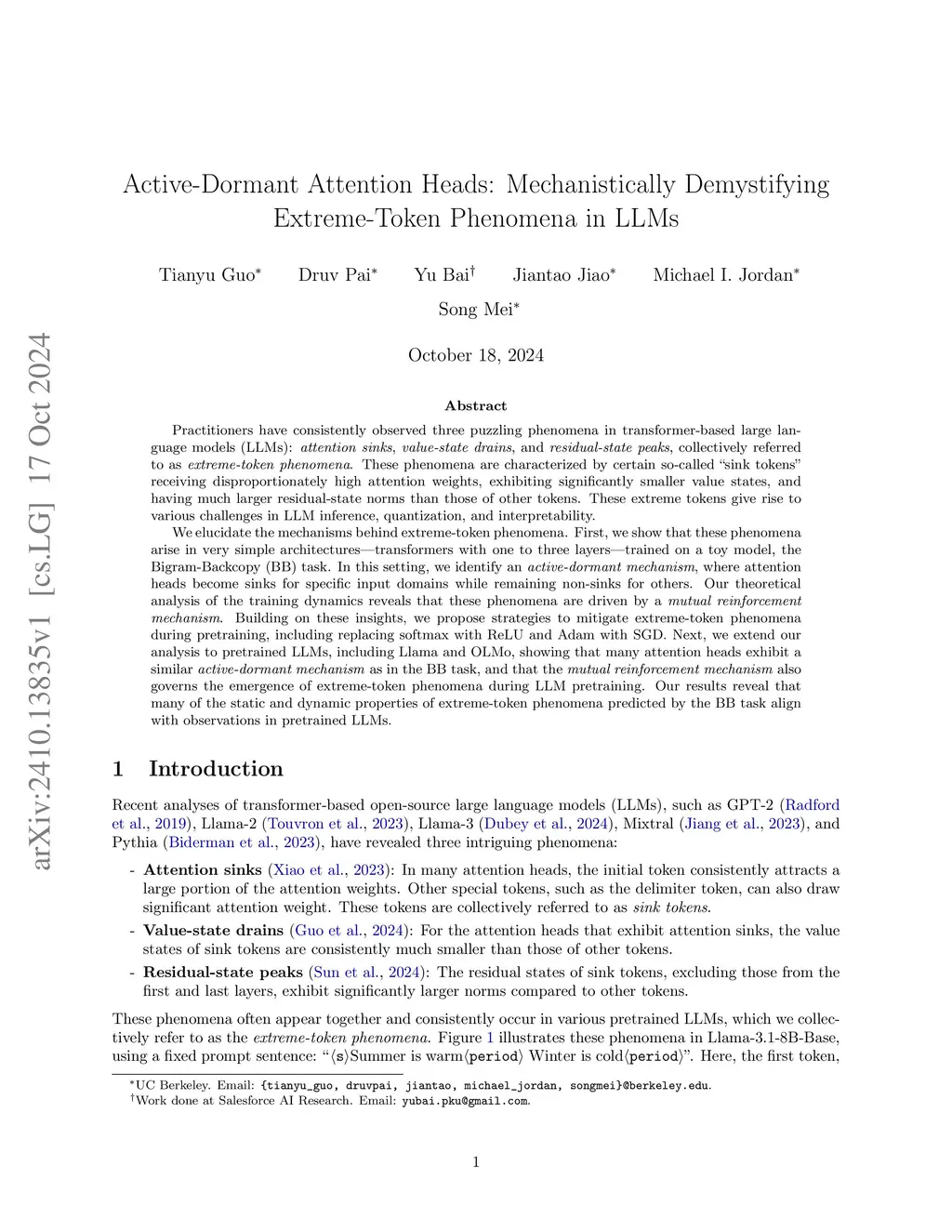 Practitioners have consistently observed three puzzling phenomena in transformer-based large language models (LLMs): attention sinks, value-state drains, and residual-state peaks, collectively referred to as extreme-token phenomena. These phenomena are characterized by certain so-called "sink tokens" receiving disproportionately high attention weights, exhibiting significantly smaller value states, and having much larger residual-state norms than those of other tokens. These extreme tokens give rise to various challenges in LLM inference, quantization, and interpretability. We elucidate the mechanisms behind extreme-token phenomena. First, we show that these phenomena arise in very simple architectures -- transformers with one to three layers -- trained on a toy model, the Bigram-Backcopy (BB) task. In this setting, we identify an active-dormant mechanism, where attention heads become sinks for specific input domains while remaining non-sinks for others. Our theoretical analysis of the training dynamics reveals that these phenomena are driven by a mutual reinforcement mechanism. Building on these insights, we propose strategies to mitigate extreme-token phenomena during pretraining, including replacing softmax with ReLU and Adam with SGD. Next, we extend our analysis to pretrained LLMs, including Llama and OLMo, showing that many attention heads exhibit a similar active-dormant mechanism as in the BB task, and that the mutual reinforcement mechanism also governs the emergence of extreme-token phenomena during LLM pretraining. Our results reveal that many of the static and dynamic properties of extreme-token phenomena predicted by the BB task align with observations in pretrained LLMs.