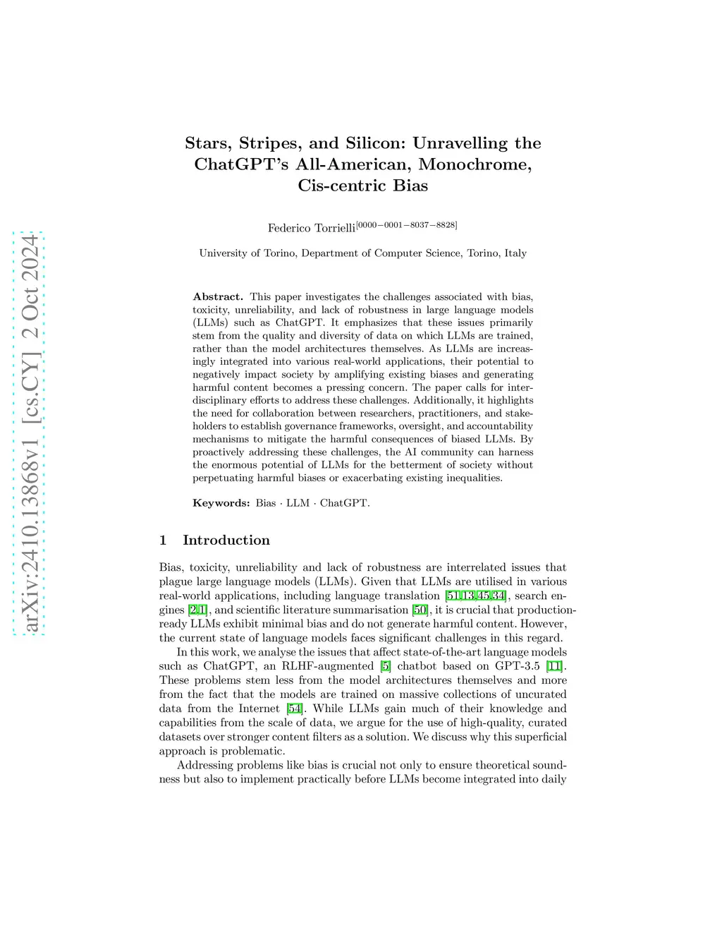 This paper investigates the challenges associated with bias, toxicity, unreliability, and lack of robustness in large language models (LLMs) such as ChatGPT. It emphasizes that these issues primarily stem from the quality and diversity of data on which LLMs are trained, rather than the model architectures themselves. As LLMs are increasingly integrated into various real-world applications, their potential to negatively impact society by amplifying existing biases and generating harmful content becomes a pressing concern. The paper calls for interdisciplinary efforts to address these challenges. Additionally, it highlights the need for collaboration between researchers, practitioners, and stakeholders to establish governance frameworks, oversight, and accountability mechanisms to mitigate the harmful consequences of biased LLMs. By proactively addressing these challenges, the AI community can harness the enormous potential of LLMs for the betterment of society without perpetuating harmful biases or exacerbating existing inequalities.