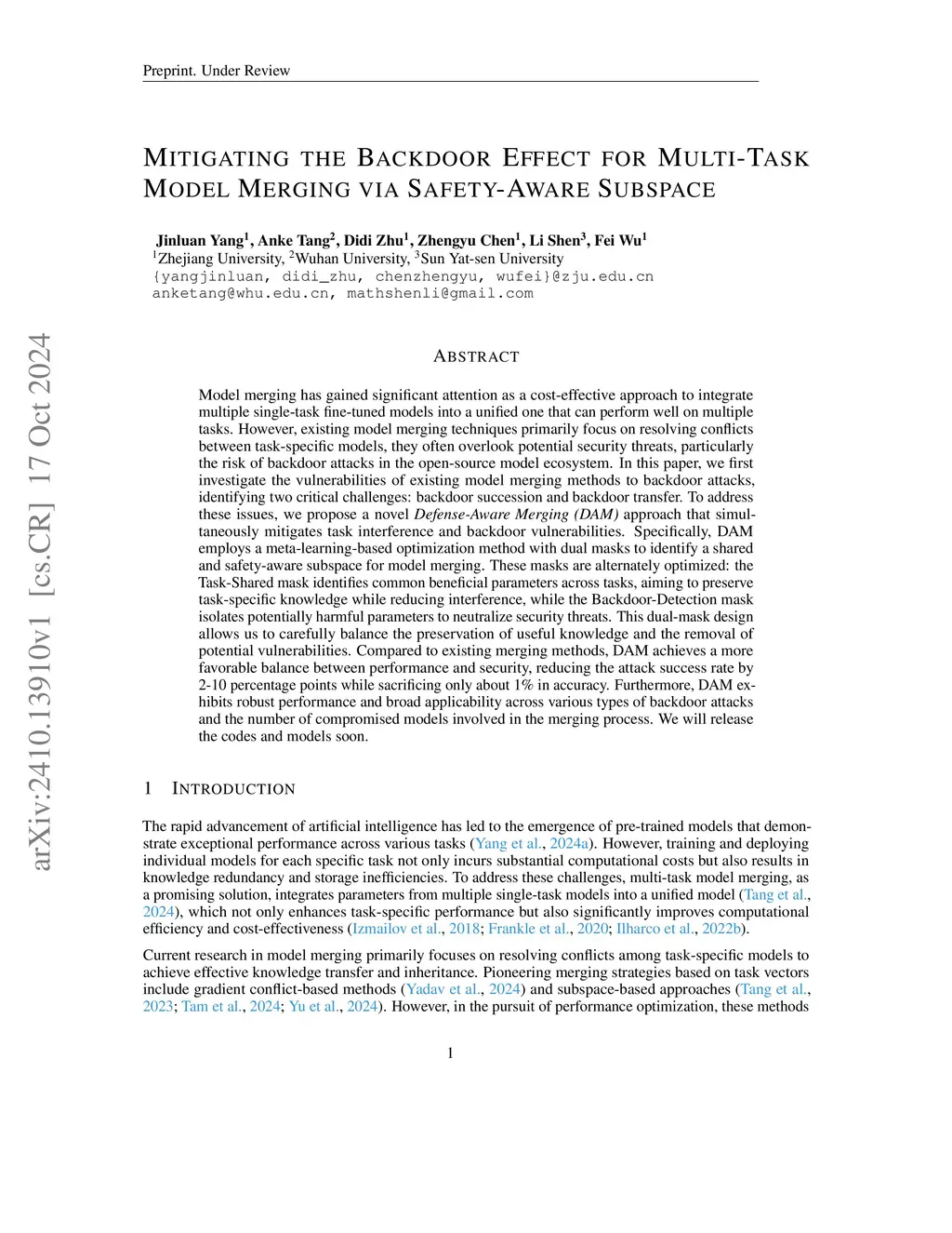 Model merging has gained significant attention as a cost-effective approach to integrate multiple single-task fine-tuned models into a unified one that can perform well on multiple tasks. However, existing model merging techniques primarily focus on resolving conflicts between task-specific models, they often overlook potential security threats, particularly the risk of backdoor attacks in the open-source model ecosystem. In this paper, we first investigate the vulnerabilities of existing model merging methods to backdoor attacks, identifying two critical challenges: backdoor succession and backdoor transfer. To address these issues, we propose a novel Defense-Aware Merging (DAM) approach that simultaneously mitigates task interference and backdoor vulnerabilities. Specifically, DAM employs a meta-learning-based optimization method with dual masks to identify a shared and safety-aware subspace for model merging. These masks are alternately optimized: the Task-Shared mask identifies common beneficial parameters across tasks, aiming to preserve task-specific knowledge while reducing interference, while the Backdoor-Detection mask isolates potentially harmful parameters to neutralize security threats. This dual-mask design allows us to carefully balance the preservation of useful knowledge and the removal of potential vulnerabilities. Compared to existing merging methods, DAM achieves a more favorable balance between performance and security, reducing the attack success rate by 2-10 percentage points while sacrificing only about 1% in accuracy. Furthermore, DAM exhibits robust performance and broad applicability across various types of backdoor attacks and the number of compromised models involved in the merging process. Our codes and models are available atthis https URL.