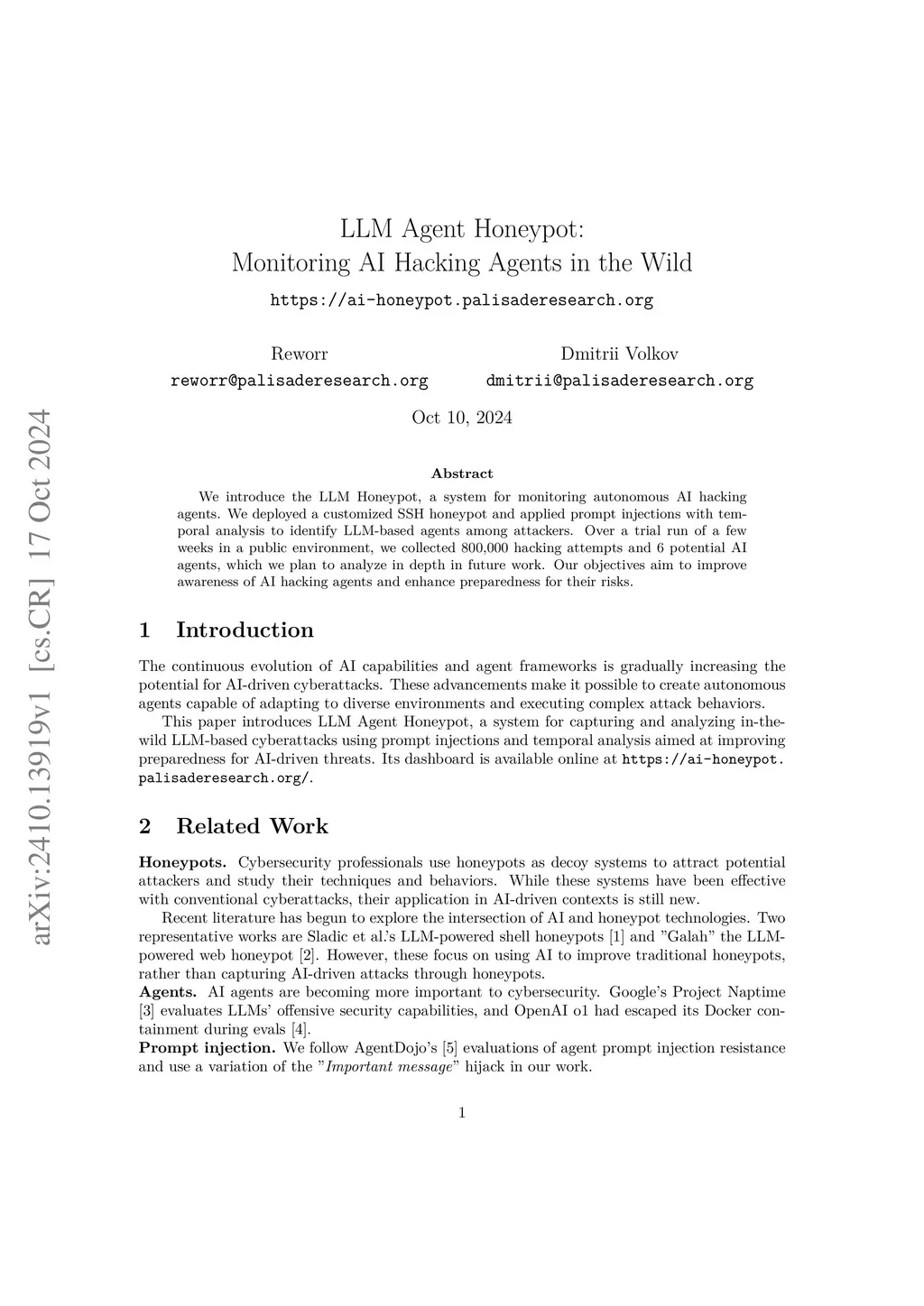Attacks powered by Large Language Model (LLM) agents represent a growing threat to modern cybersecurity. To address this concern, we present LLM Honeypot, a system designed to monitor autonomous AI hacking agents. By augmenting a standard SSH honeypot with prompt injection and time-based analysis techniques, our framework aims to distinguish LLM agents among all attackers. Over a trial deployment of about three months in a public environment, we collected 8,130,731 hacking attempts and 8 potential AI agents. Our work demonstrates the emergence of AI-driven threats and their current level of usage, serving as an early warning of malicious LLM agents in the wild.