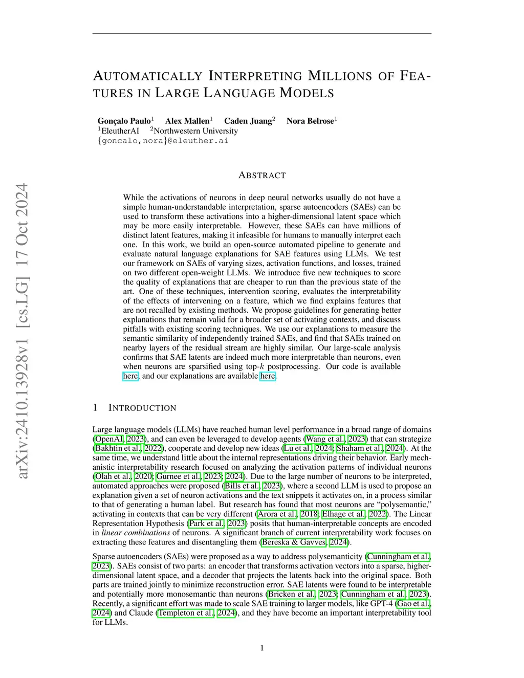 While the activations of neurons in deep neural networks usually do not have a simple human-understandable interpretation, sparse autoencoders (SAEs) can be used to transform these activations into a higher-dimensional latent space which may be more easily interpretable. However, these SAEs can have millions of distinct latent features, making it infeasible for humans to manually interpret each one. In this work, we build an open-source automated pipeline to generate and evaluate natural language explanations for SAE features using LLMs. We test our framework on SAEs of varying sizes, activation functions, and losses, trained on two different open-weight LLMs. We introduce five new techniques to score the quality of explanations that are cheaper to run than the previous state of the art. One of these techniques, intervention scoring, evaluates the interpretability of the effects of intervening on a feature, which we find explains features that are not recalled by existing methods. We propose guidelines for generating better explanations that remain valid for a broader set of activating contexts, and discuss pitfalls with existing scoring techniques. We use our explanations to measure the semantic similarity of independently trained SAEs, and find that SAEs trained on nearby layers of the residual stream are highly similar. Our large-scale analysis confirms that SAE latents are indeed much more interpretable than neurons, even when neurons are sparsified using top- postprocessing. Our code is available atthis https URL, and our explanations are available atthis https URL.