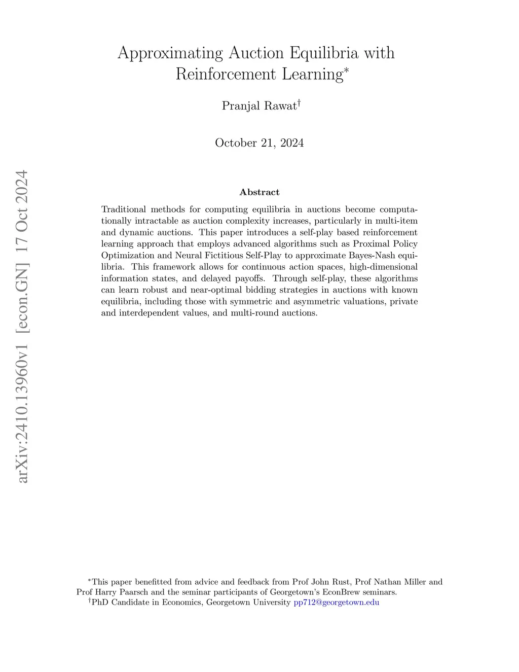 Traditional methods for computing equilibria in auctions become computationally intractable as auction complexity increases, particularly in multi-item and dynamic auctions. This paper introduces a self-play based reinforcement learning approach that employs advanced algorithms such as Proximal Policy Optimization and Neural Fictitious Self-Play to approximate Bayes-Nash equilibria. This framework allows for continuous action spaces, high-dimensional information states, and delayed payoffs. Through self-play, these algorithms can learn robust and near-optimal bidding strategies in auctions with known equilibria, including those with symmetric and asymmetric valuations, private and interdependent values, and multi-round auctions.
