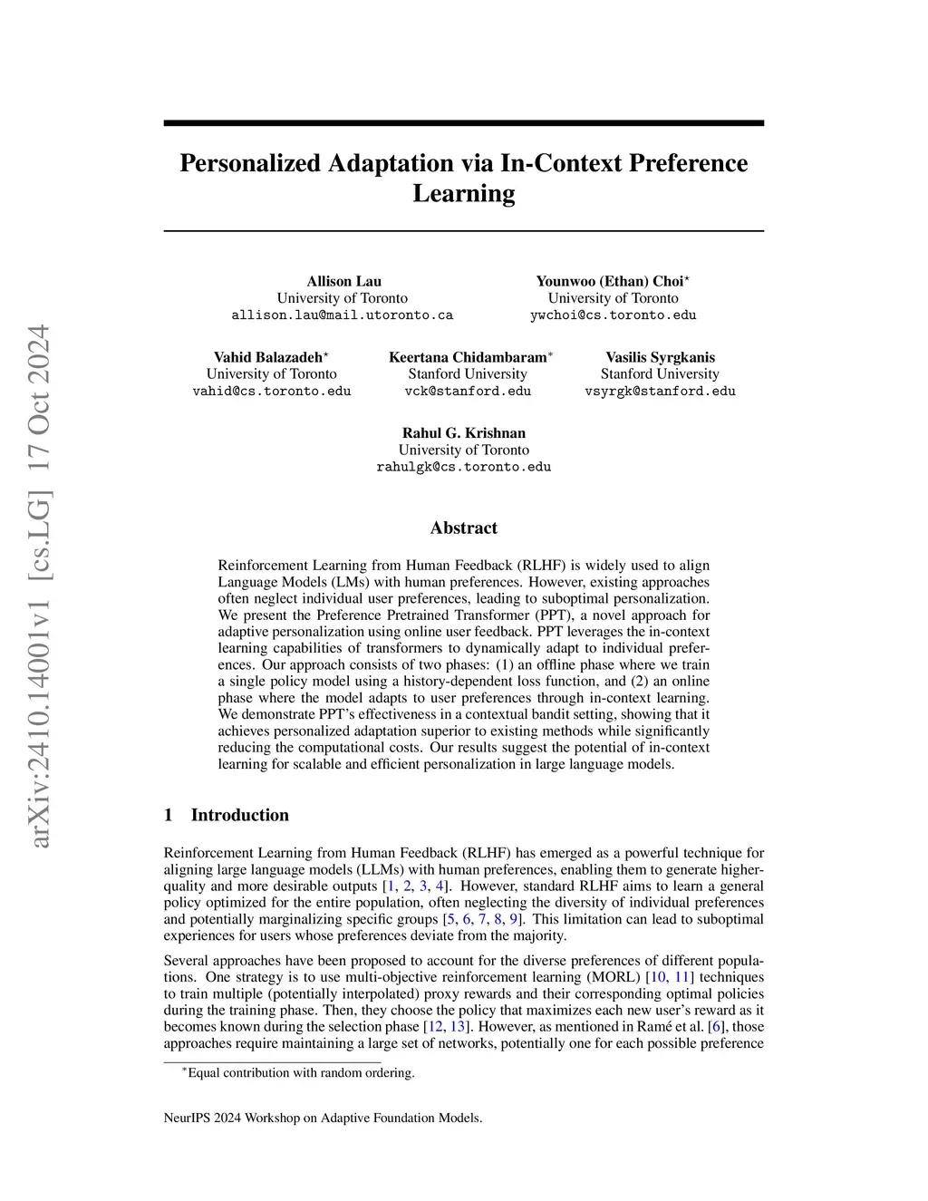 Reinforcement Learning from Human Feedback (RLHF) is widely used to align Language Models (LMs) with human preferences. However, existing approaches often neglect individual user preferences, leading to suboptimal personalization. We present the Preference Pretrained Transformer (PPT), a novel approach for adaptive personalization using online user feedback. PPT leverages the in-context learning capabilities of transformers to dynamically adapt to individual preferences. Our approach consists of two phases: (1) an offline phase where we train a single policy model using a history-dependent loss function, and (2) an online phase where the model adapts to user preferences through in-context learning. We demonstrate PPT's effectiveness in a contextual bandit setting, showing that it achieves personalized adaptation superior to existing methods while significantly reducing the computational costs. Our results suggest the potential of in-context learning for scalable and efficient personalization in large language models.