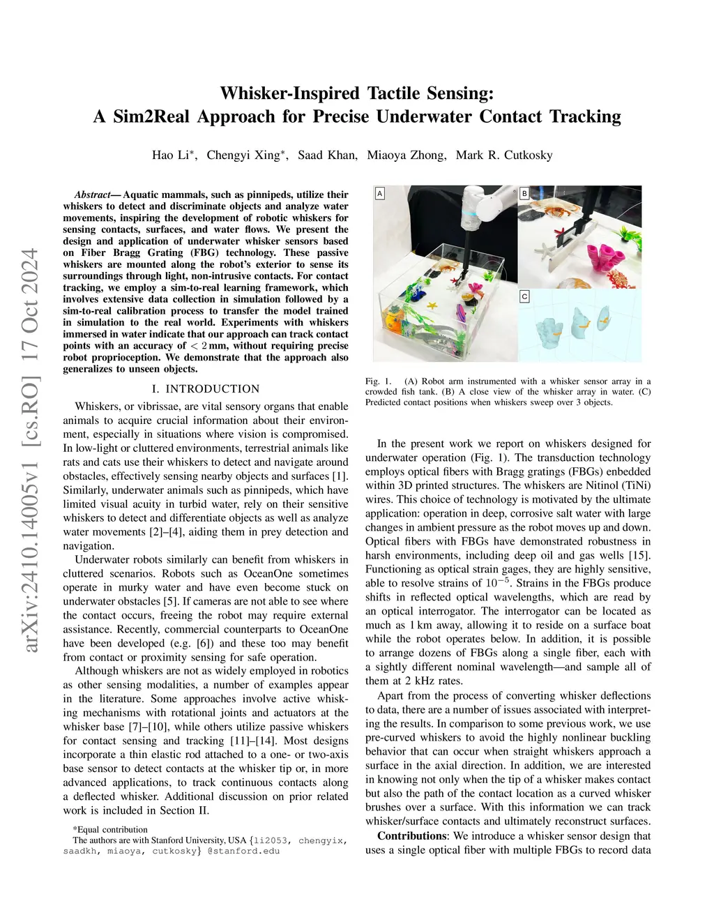 Aquatic mammals, such as pinnipeds, utilize their whiskers to detect and discriminate objects and analyze water movements, inspiring the development of robotic whiskers for sensing contacts, surfaces, and water flows. We present the design and application of underwater whisker sensors based on Fiber Bragg Grating (FBG) technology. These passive whiskers are mounted along the robots exterior to sense its surroundings through light, non-intrusive contacts. For contact tracking, we employ a sim-to-real learning framework, which involves extensive data collection in simulation followed by a sim-to-real calibration process to transfer the model trained in simulation to the real world. Experiments with whiskers immersed in water indicate that our approach can track contact points with an accuracy of mm, without requiring precise robot proprioception. We demonstrate that the approach also generalizes to unseen objects.