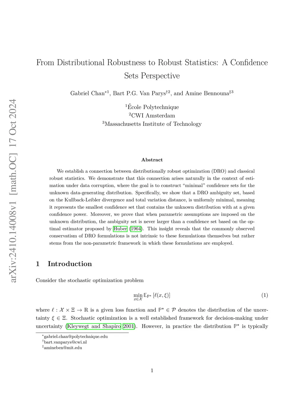 We establish a connection between distributionally robust optimization (DRO) and classical robust statistics. We demonstrate that this connection arises naturally in the context of estimation under data corruption, where the goal is to construct ``minimal'' confidence sets for the unknown data-generating distribution. Specifically, we show that a DRO ambiguity set, based on the Kullback-Leibler divergence and total variation distance, is uniformly minimal, meaning it represents the smallest confidence set that contains the unknown distribution with at a given confidence power. Moreover, we prove that when parametric assumptions are imposed on the unknown distribution, the ambiguity set is never larger than a confidence set based on the optimal estimator proposed by Huber. This insight reveals that the commonly observed conservatism of DRO formulations is not intrinsic to these formulations themselves but rather stems from the non-parametric framework in which these formulations are employed.