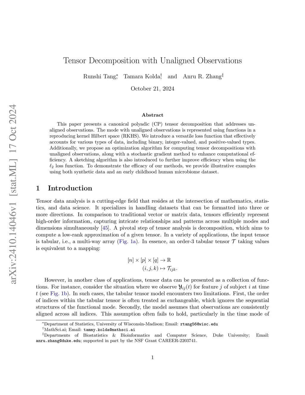 This paper presents a canonical polyadic (CP) tensor decomposition that addresses unaligned observations. The mode with unaligned observations is represented using functions in a reproducing kernel Hilbert space (RKHS). We introduce a versatile loss function that effectively accounts for various types of data, including binary, integer-valued, and positive-valued types. Additionally, we propose an optimization algorithm for computing tensor decompositions with unaligned observations, along with a stochastic gradient method to enhance computational efficiency. A sketching algorithm is also introduced to further improve efficiency when using the loss function. To demonstrate the efficacy of our methods, we provide illustrative examples using both synthetic data and an early childhood human microbiome dataset.