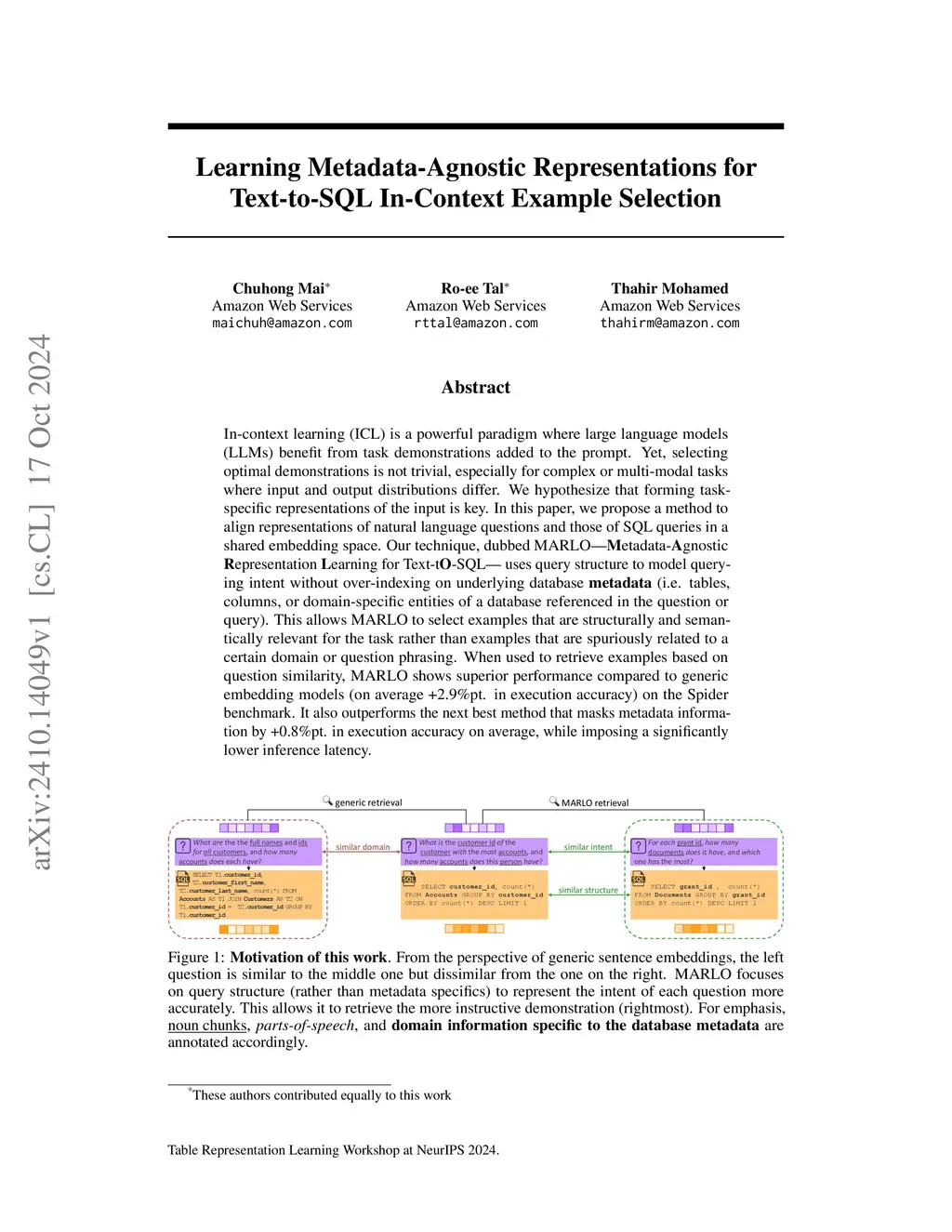 In-context learning (ICL) is a powerful paradigm where large language models (LLMs) benefit from task demonstrations added to the prompt. Yet, selecting optimal demonstrations is not trivial, especially for complex or multi-modal tasks where input and output distributions differ. We hypothesize that forming task-specific representations of the input is key. In this paper, we propose a method to align representations of natural language questions and those of SQL queries in a shared embedding space. Our technique, dubbed MARLO - Metadata-Agnostic Representation Learning for Text-tO-SQL - uses query structure to model querying intent without over-indexing on underlying database metadata (i.e. tables, columns, or domain-specific entities of a database referenced in the question or query). This allows MARLO to select examples that are structurally and semantically relevant for the task rather than examples that are spuriously related to a certain domain or question phrasing. When used to retrieve examples based on question similarity, MARLO shows superior performance compared to generic embedding models (on average +2.9\%pt. in execution accuracy) on the Spider benchmark. It also outperforms the next best method that masks metadata information by +0.8\%pt. in execution accuracy on average, while imposing a significantly lower inference latency.