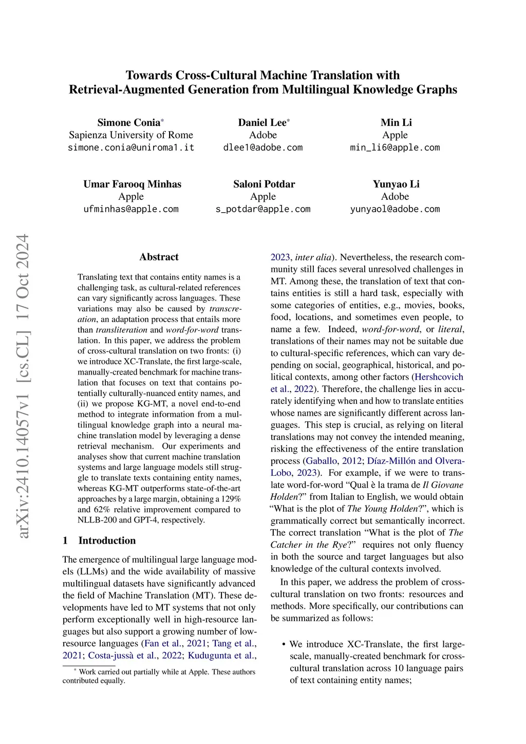 Translating text that contains entity names is a challenging task, as cultural-related references can vary significantly across languages. These variations may also be caused by transcreation, an adaptation process that entails more than transliteration and word-for-word translation. In this paper, we address the problem of cross-cultural translation on two fronts: (i) we introduce XC-Translate, the first large-scale, manually-created benchmark for machine translation that focuses on text that contains potentially culturally-nuanced entity names, and (ii) we propose KG-MT, a novel end-to-end method to integrate information from a multilingual knowledge graph into a neural machine translation model by leveraging a dense retrieval mechanism. Our experiments and analyses show that current machine translation systems and large language models still struggle to translate texts containing entity names, whereas KG-MT outperforms state-of-the-art approaches by a large margin, obtaining a 129% and 62% relative improvement compared to NLLB-200 and GPT-4, respectively.
